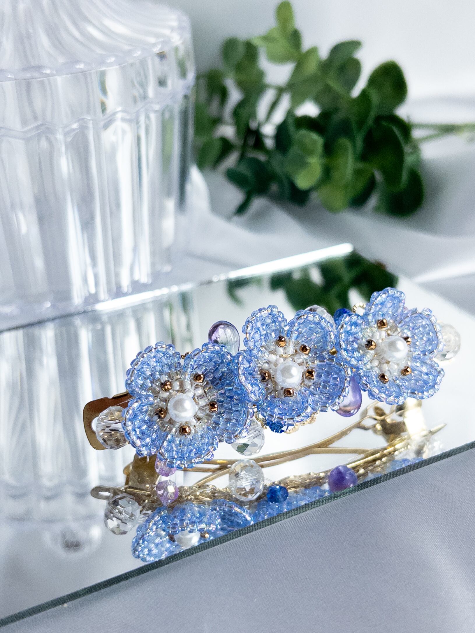 爽やかなネモフィラをモチーフにした、きらびやかで魅力的なデザインのバレッタです。