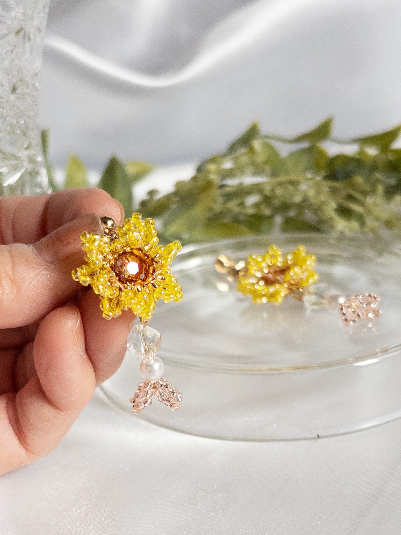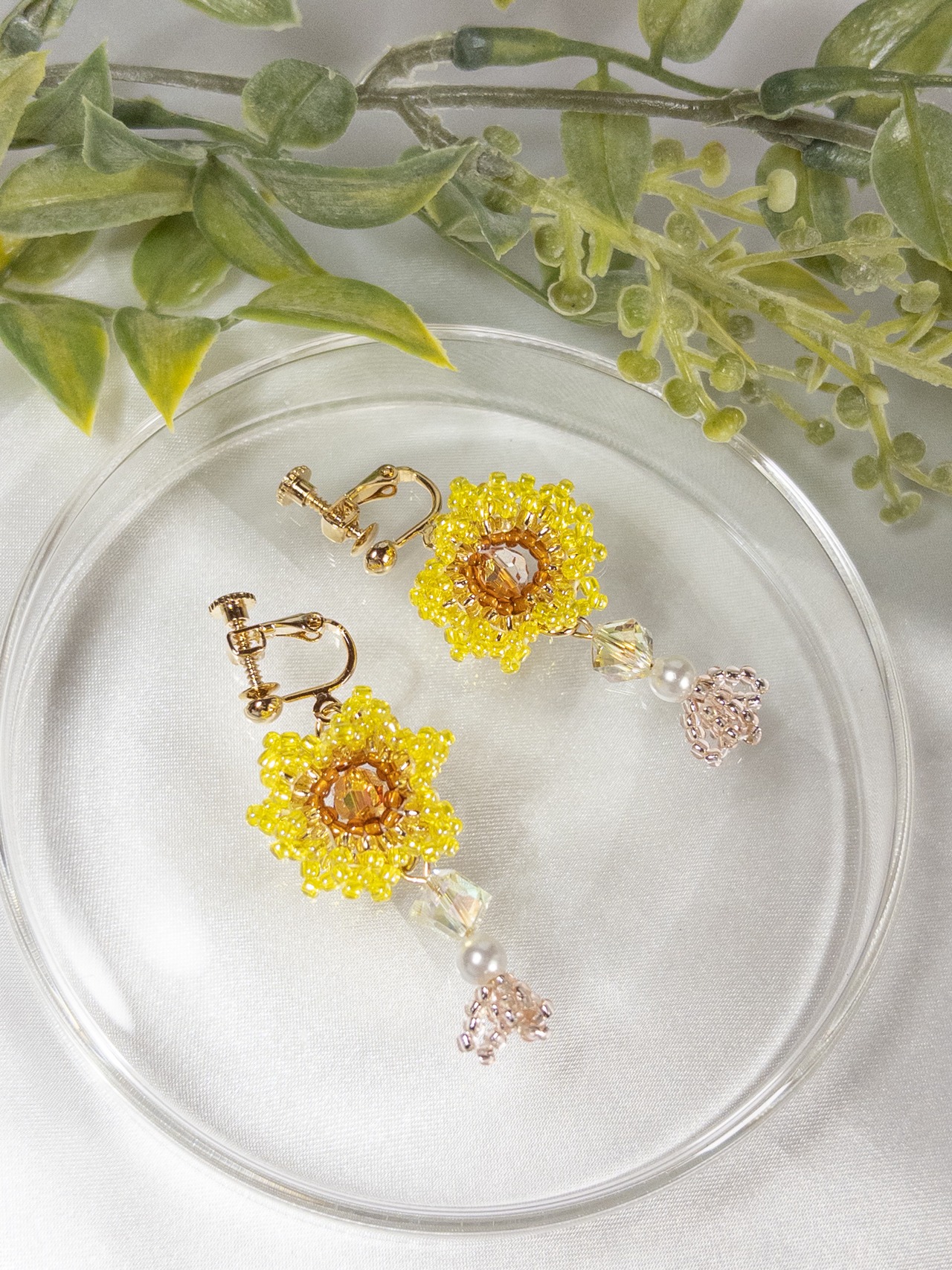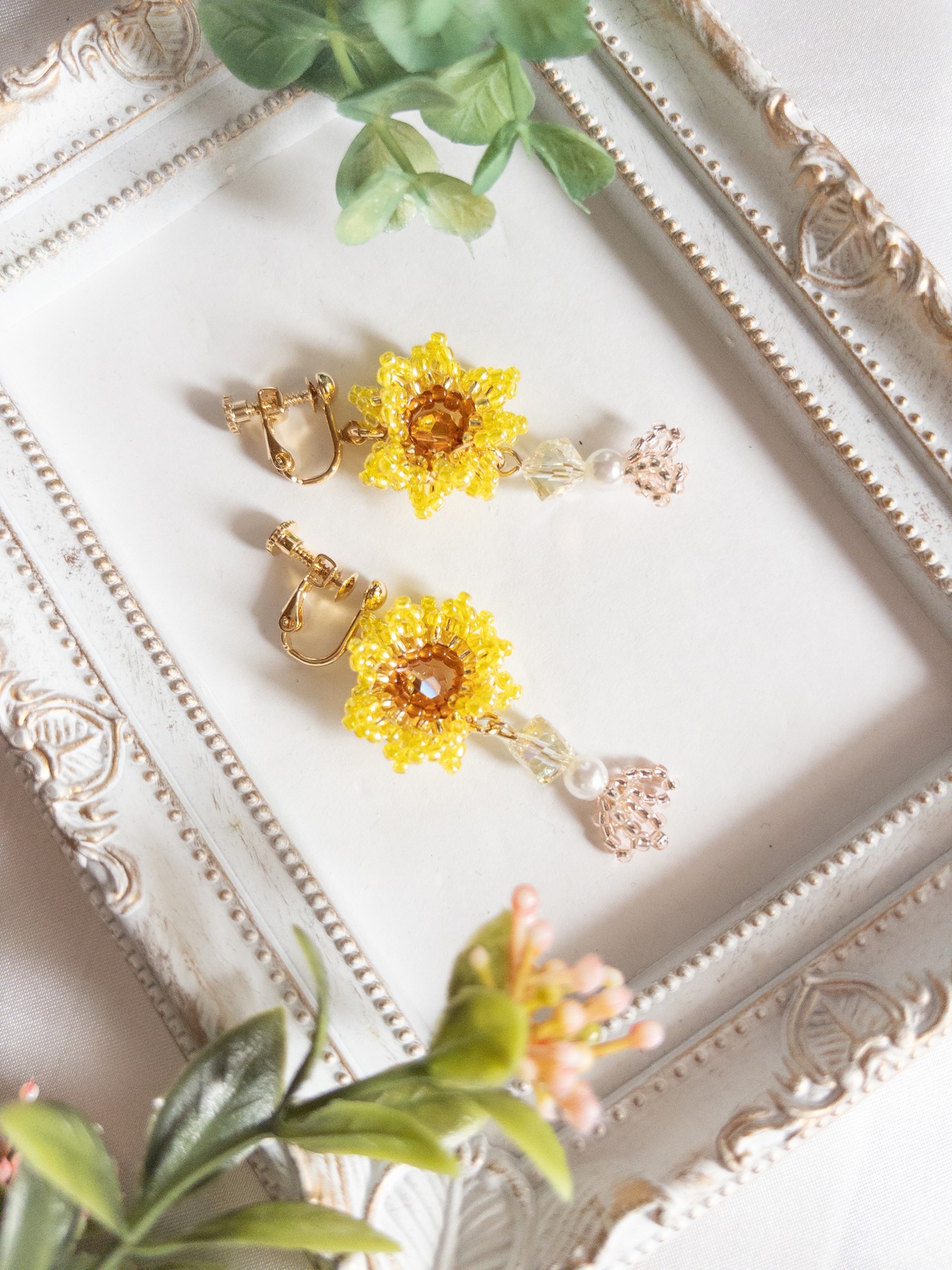 このひまわりのイヤリング&ピアスは、夏のイベントやお出かけにも最適です。