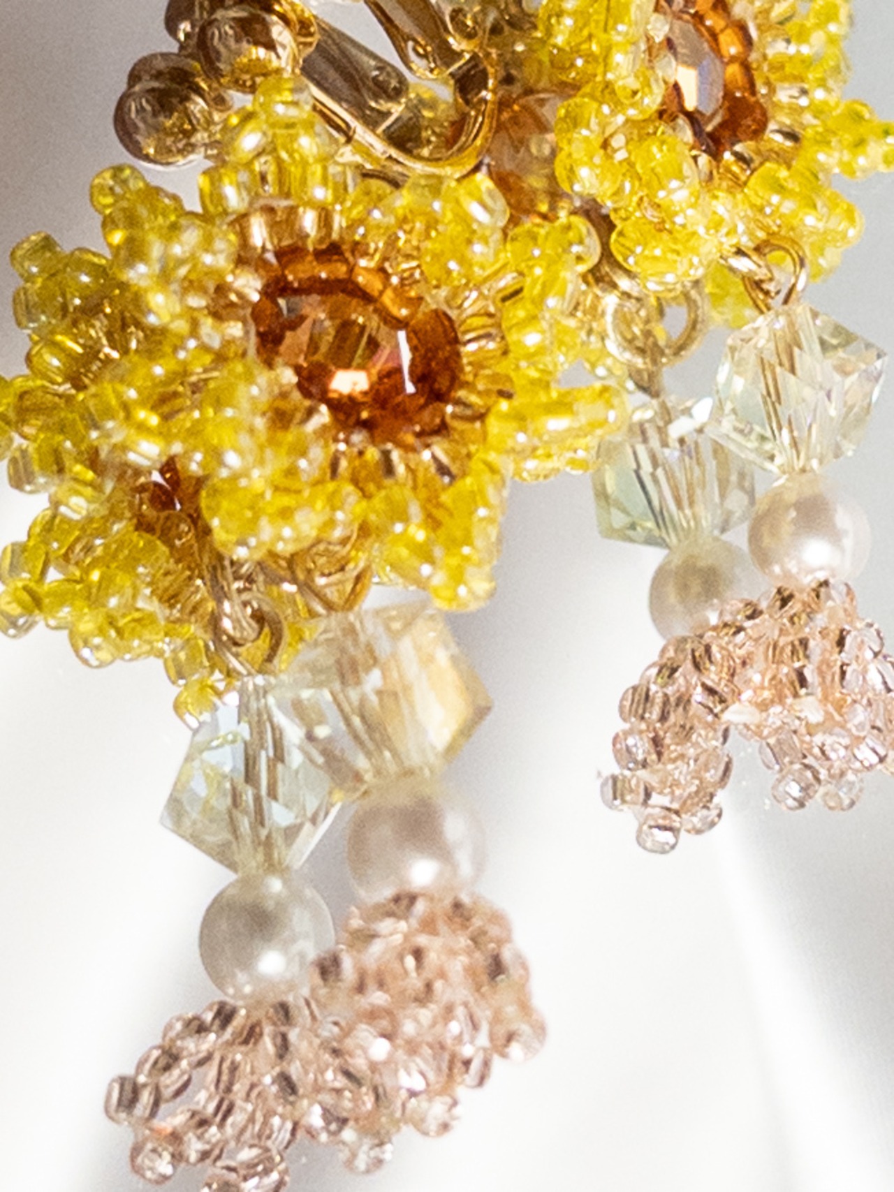 また、ひまわりモチーフの下には、特徴的なビーズとパール、キラキラのビーズで小さなフリルを作り、動くと揺れるようにつけました。