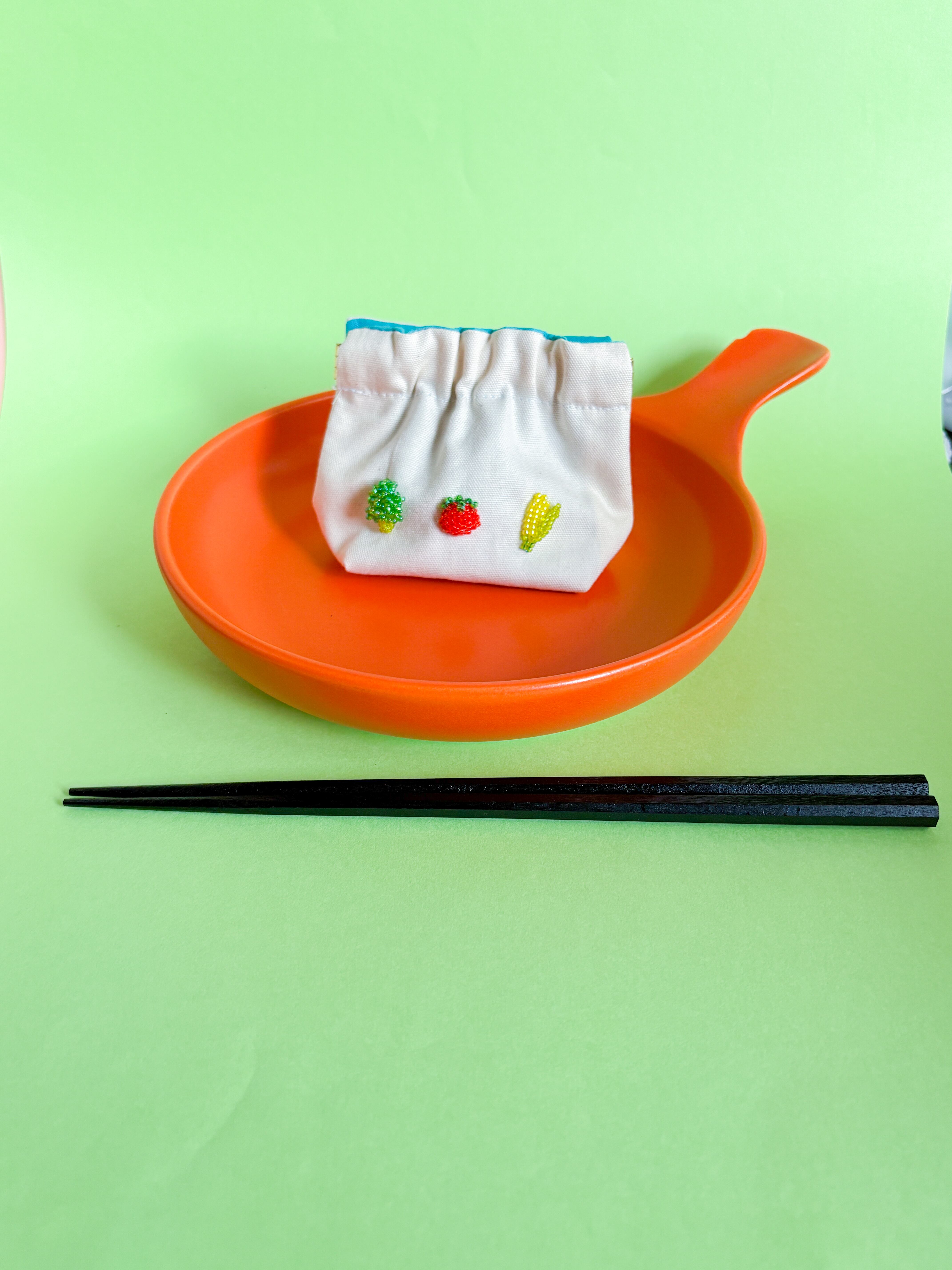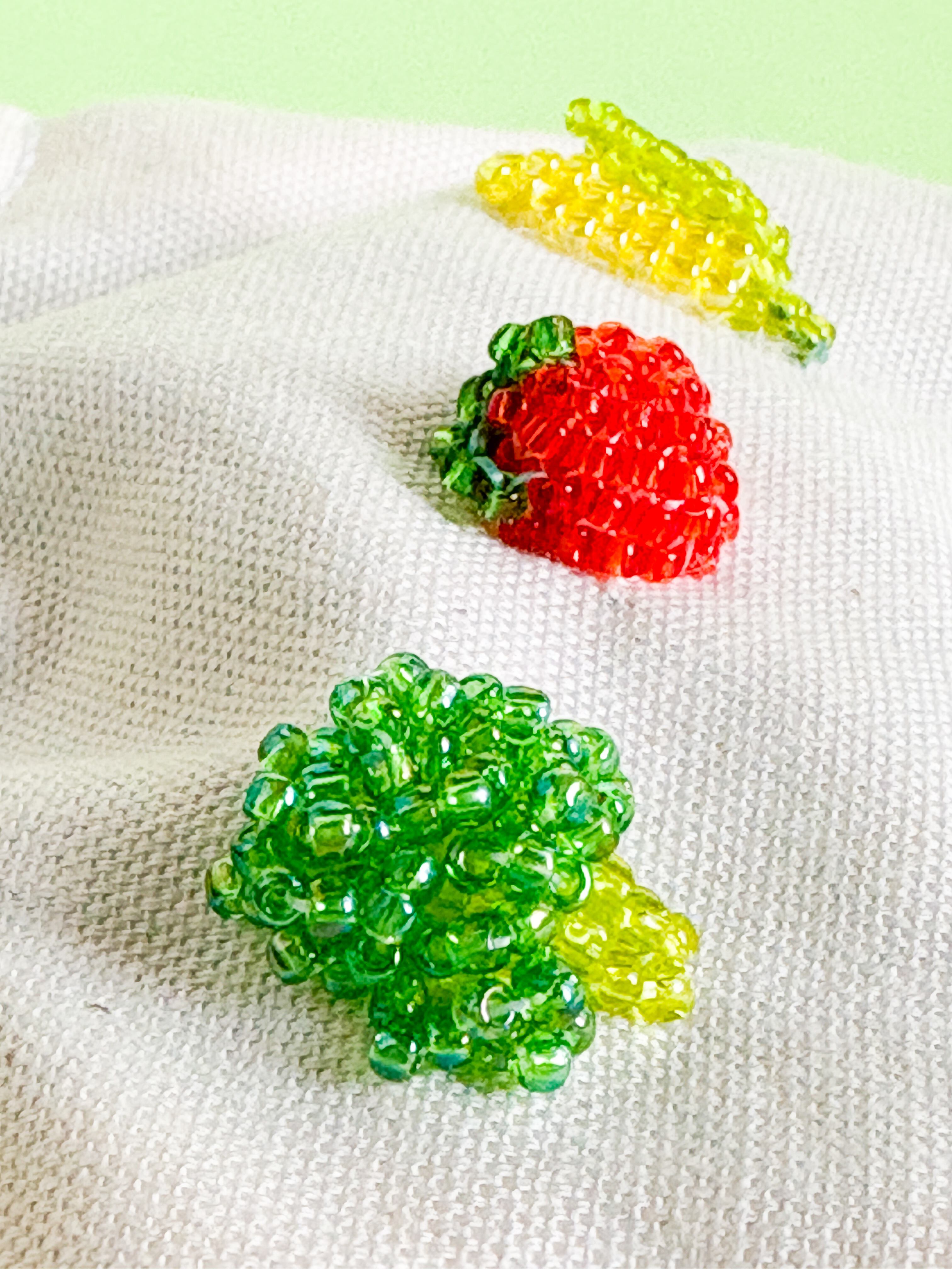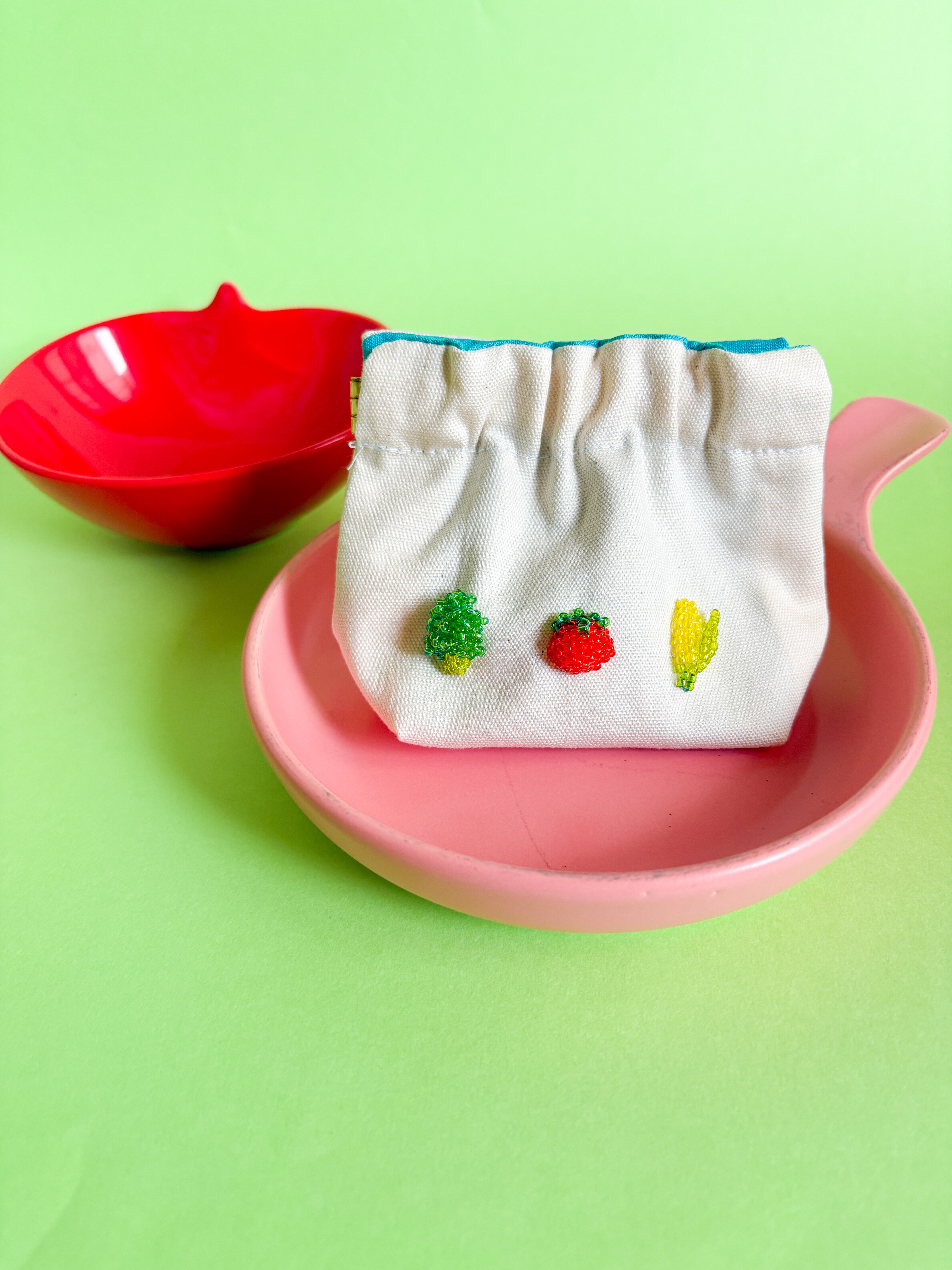 かわいらしい野菜のモチーフがビーズで立体的に表現された、ユニークなアイテムです。
