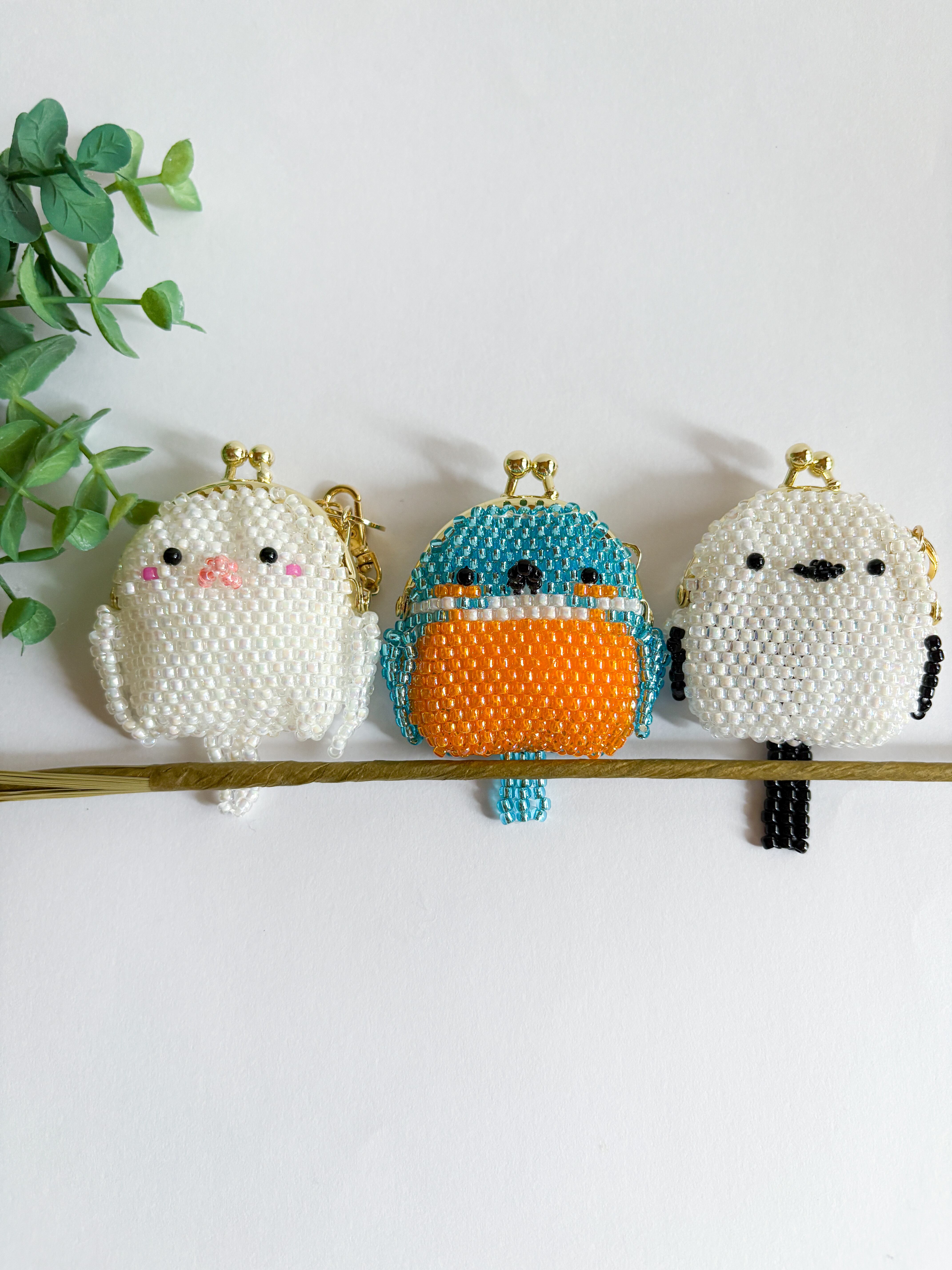 ひらりと飛んできたカワセミをモチーフにして、ビーズのがま口ポーチにしました。