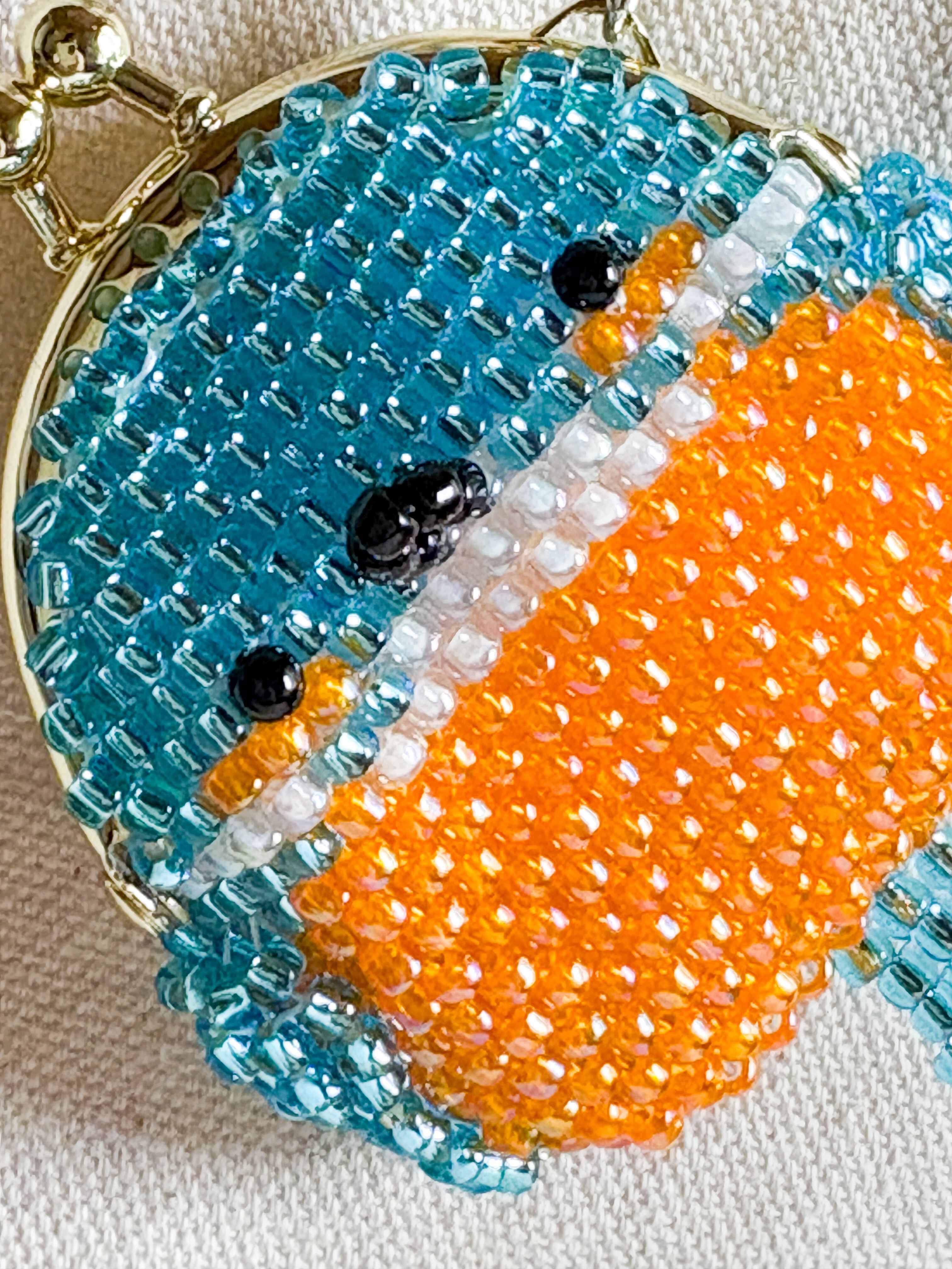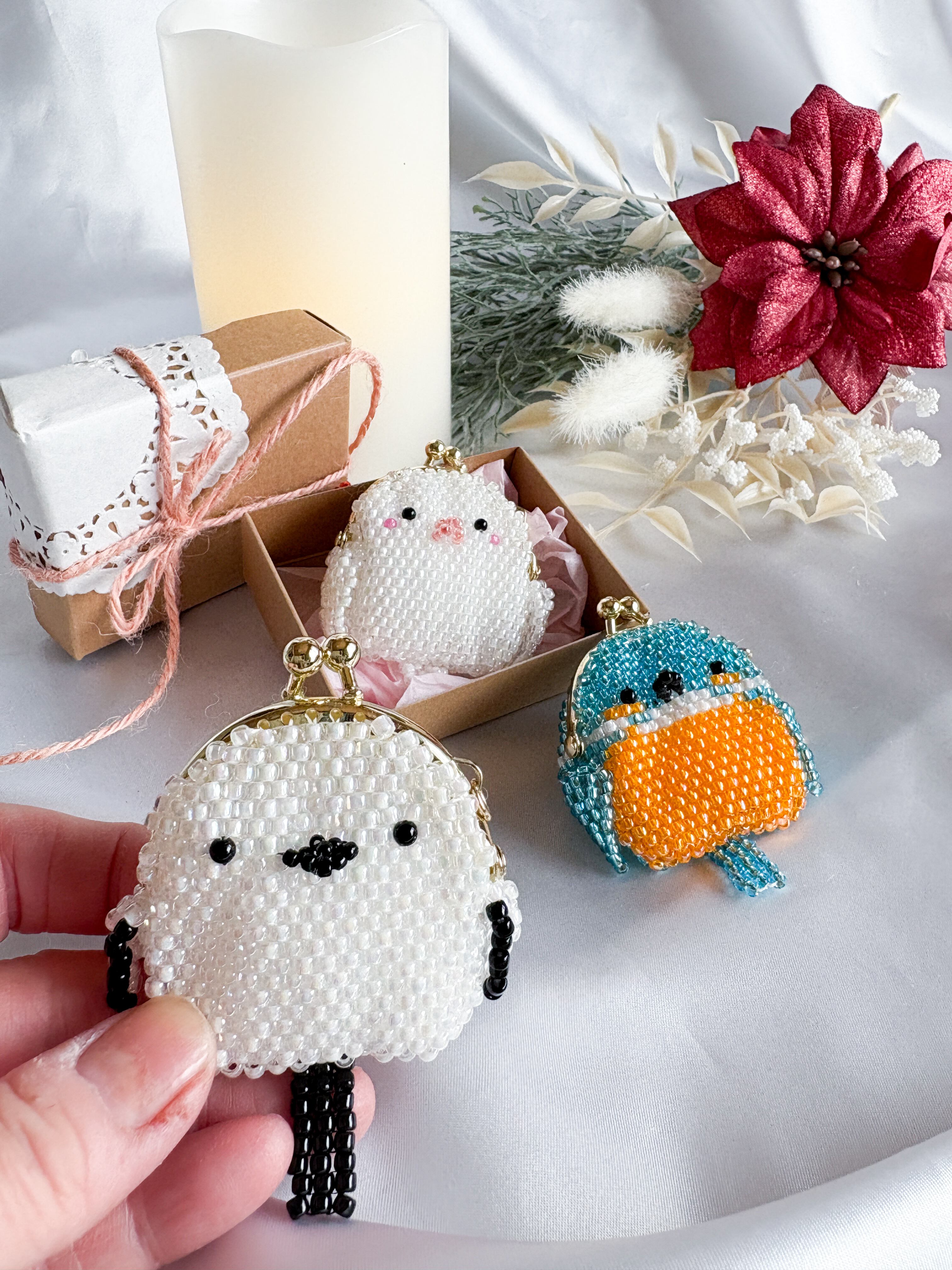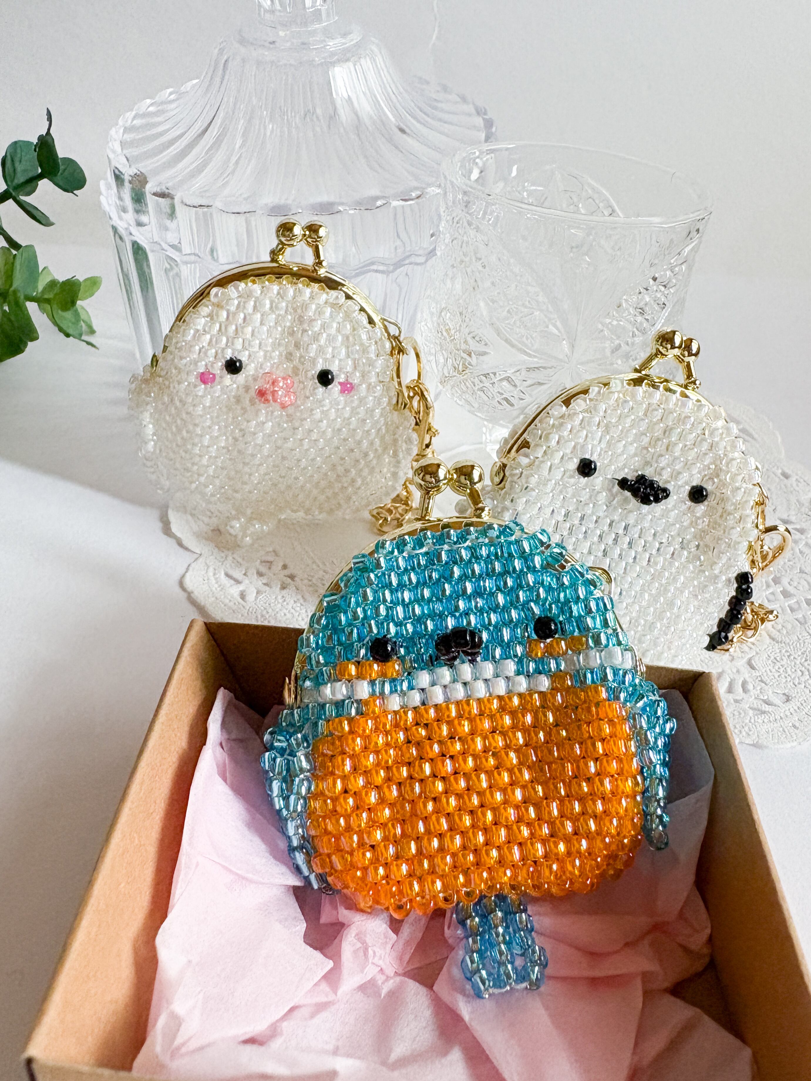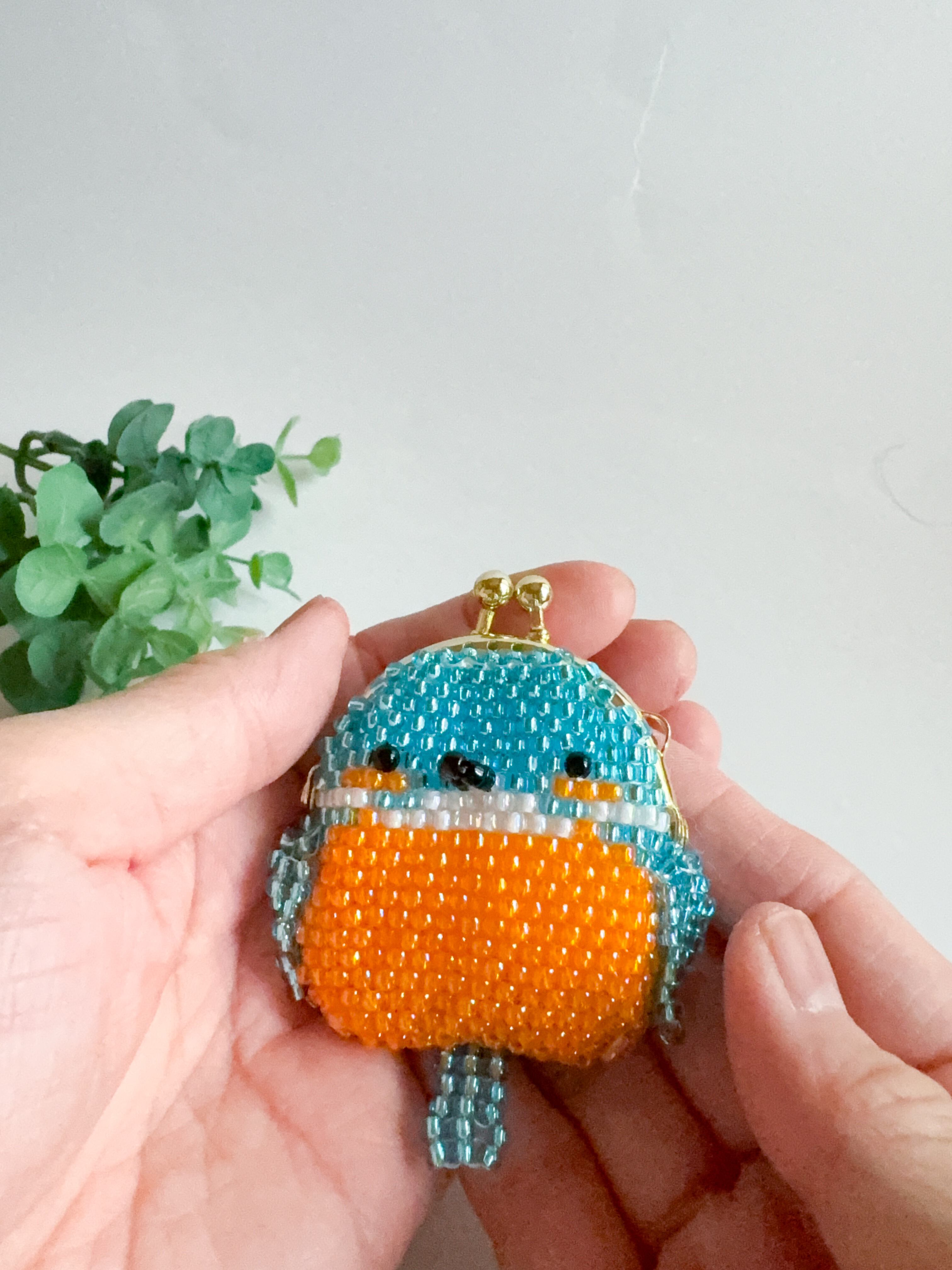 ビーズは、本物のカワセミのようにキラキラした綺麗な色が使いたかったので、銀色の入った綺麗な青色と、キラキラした仕上がりのオレンジや白色を使いました。