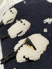 この作品は、もふもふのボアの毛並みとキラキラと輝くビーズ刺繍が特徴です。