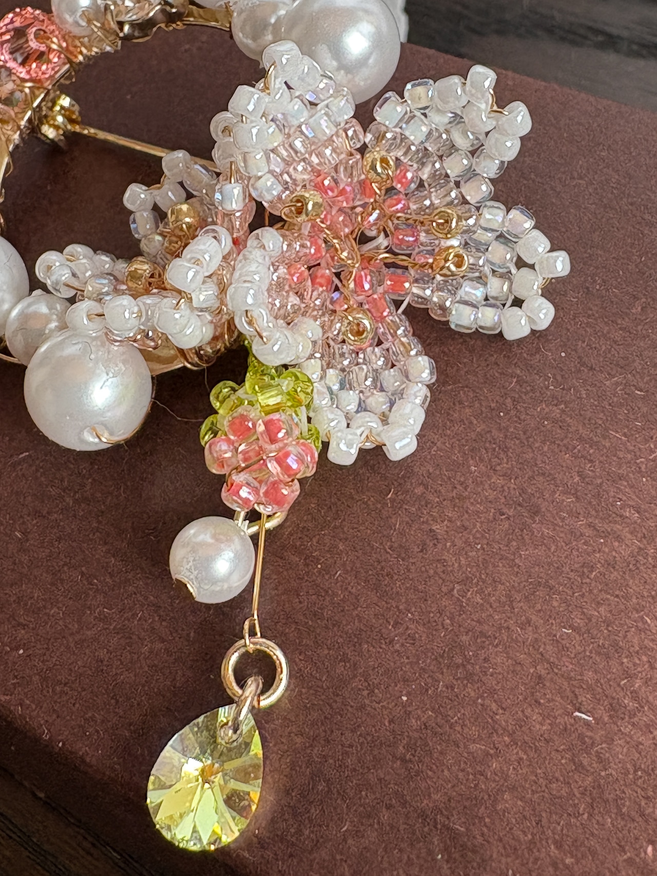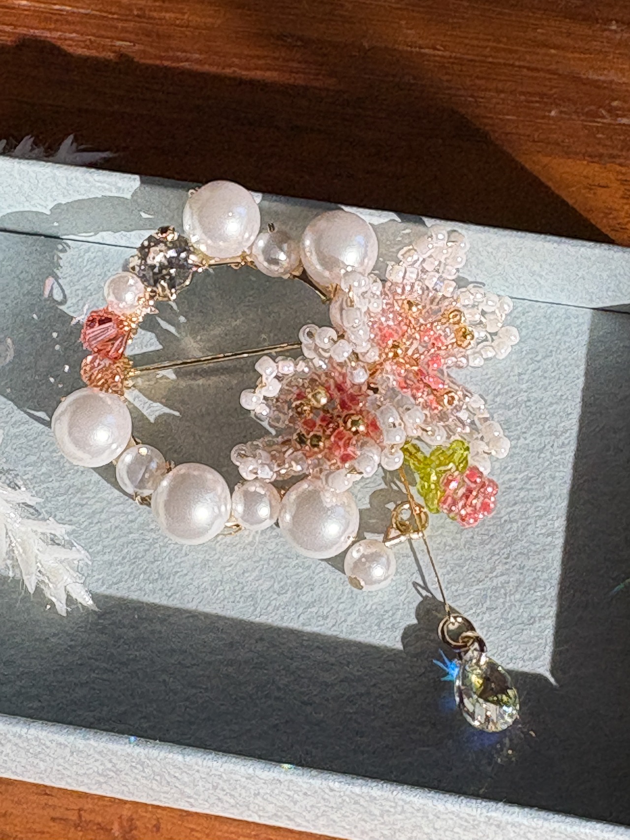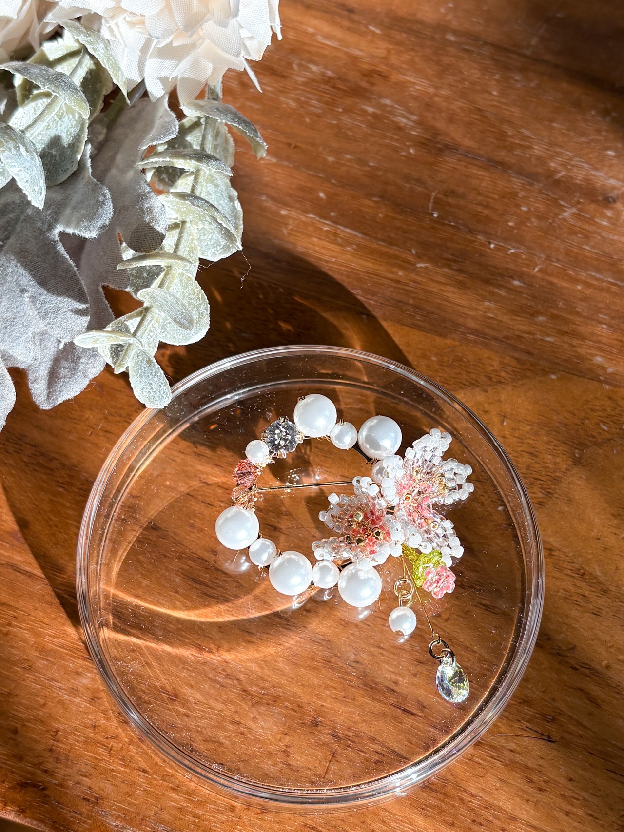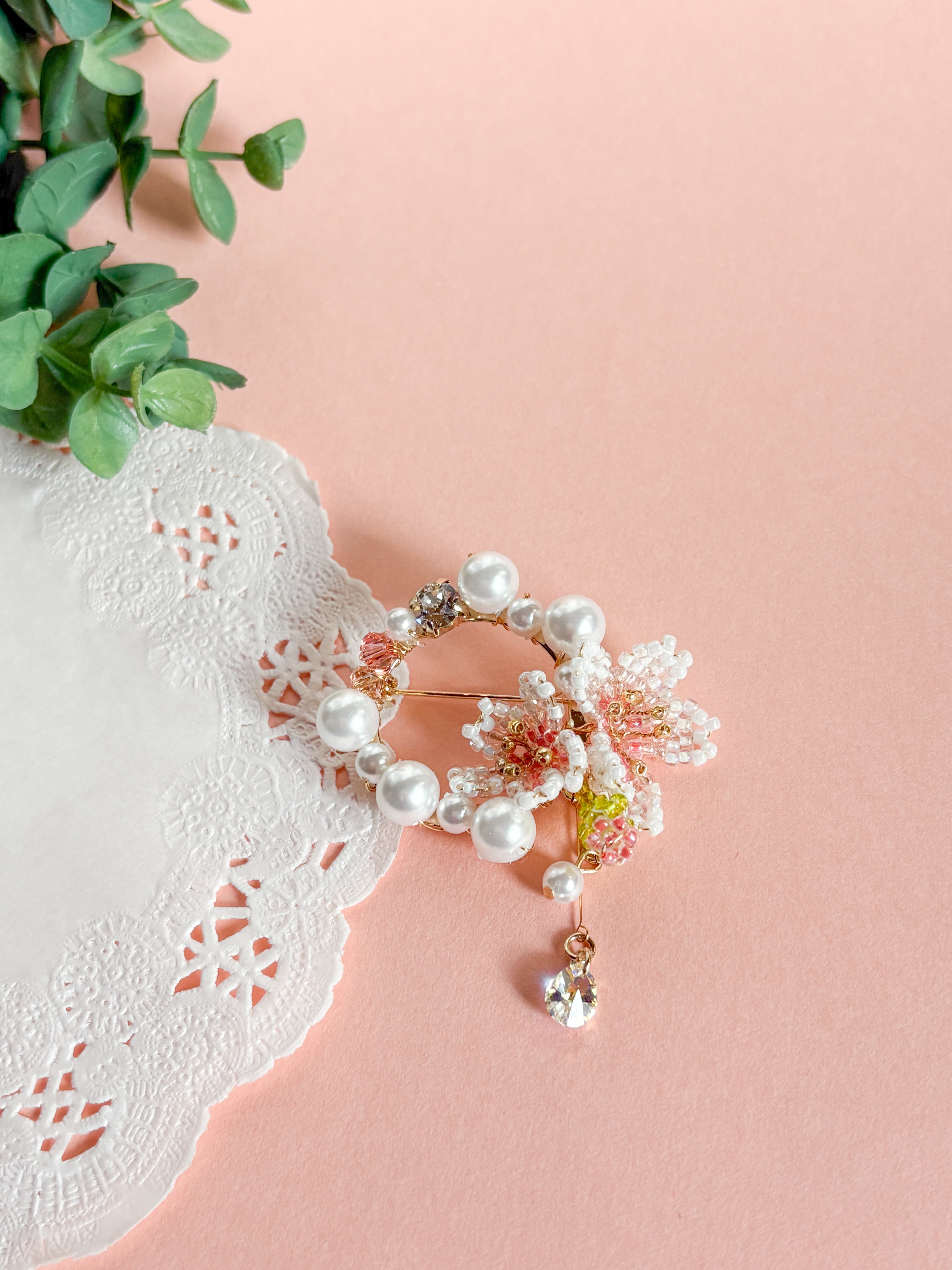ビーズで作った桜と共に、パールとクリスタルガラスをつけました。