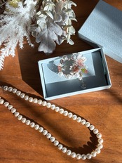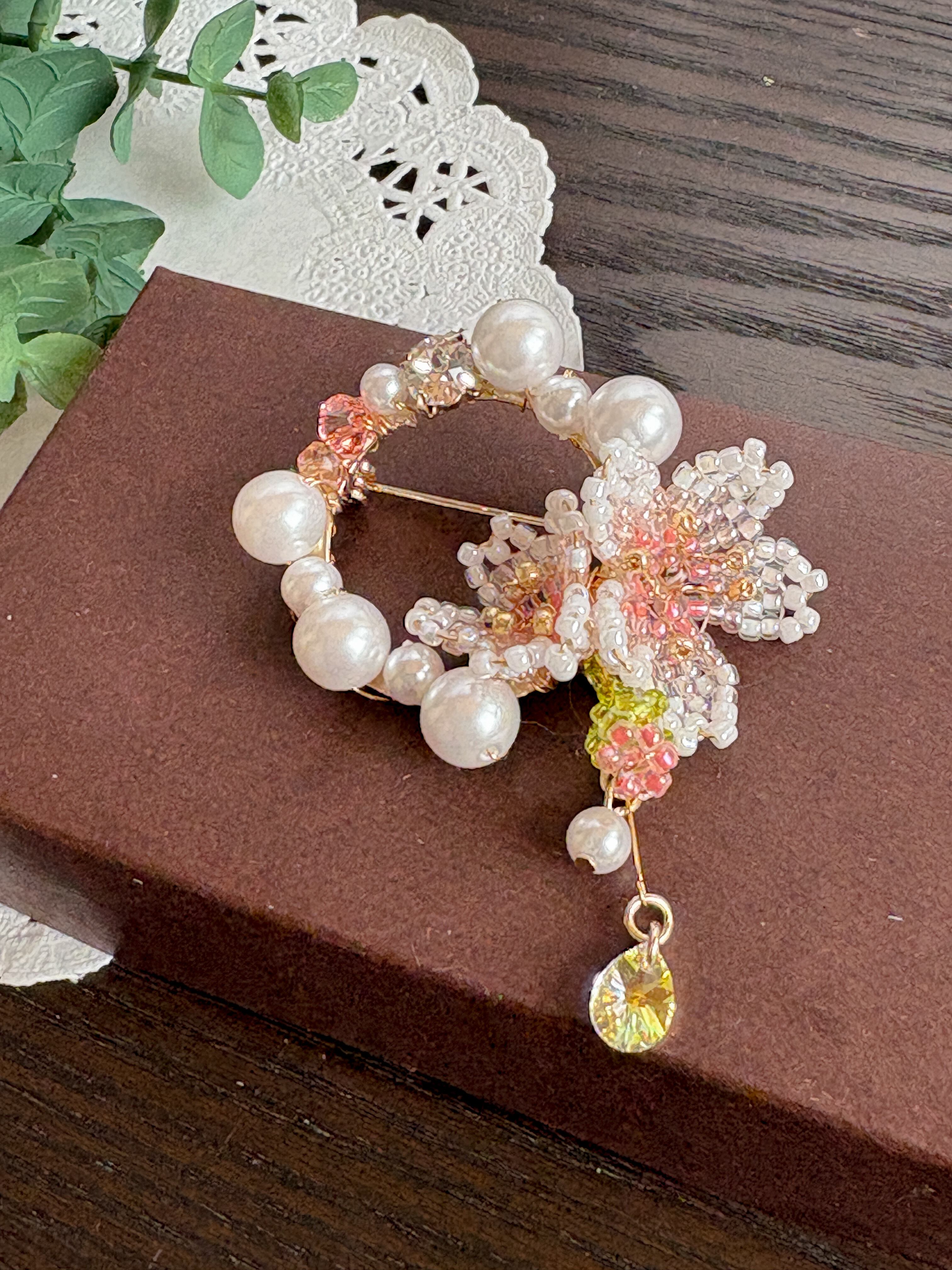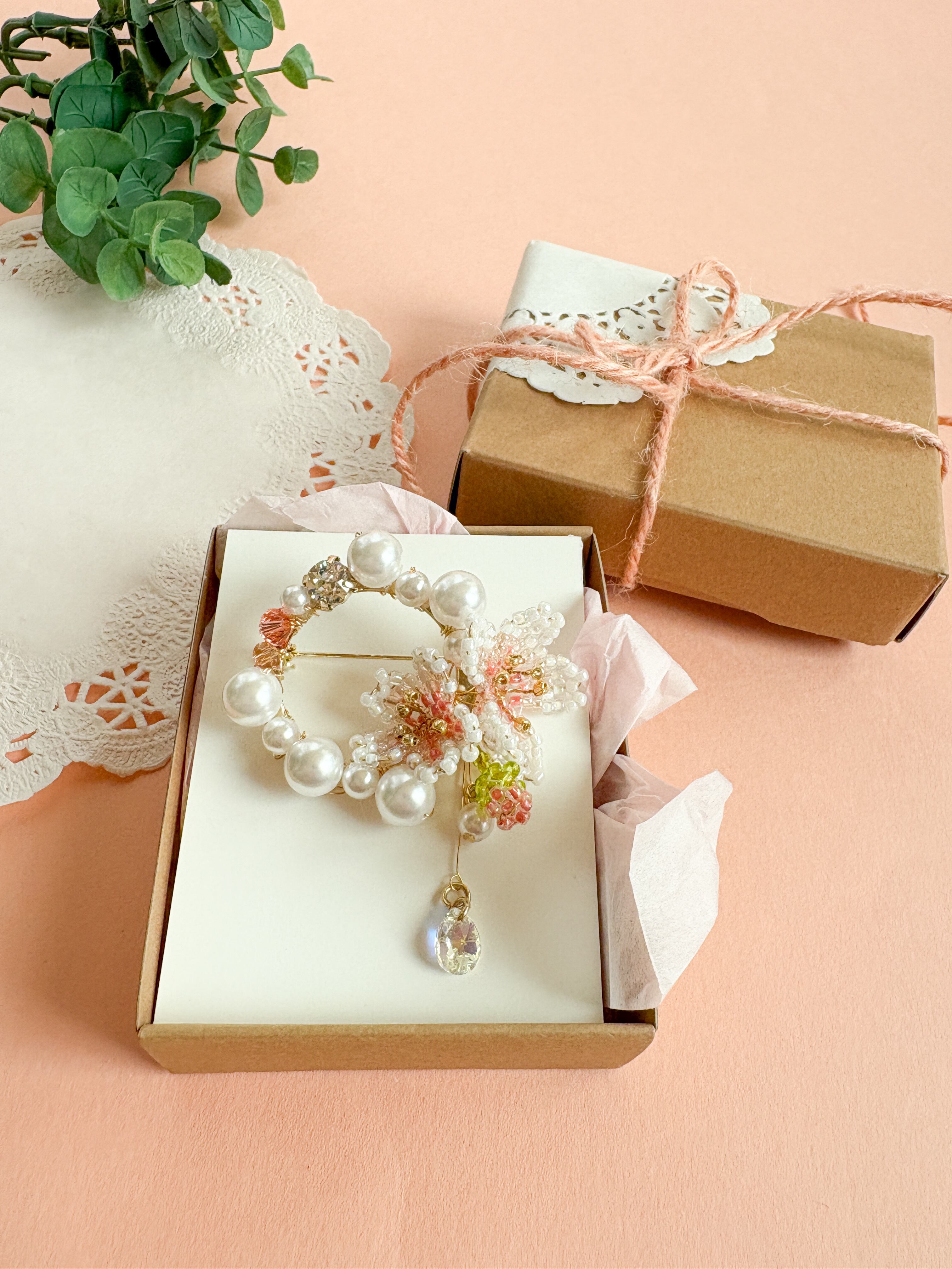 華やかな桜とパールのブローチをお届けします。