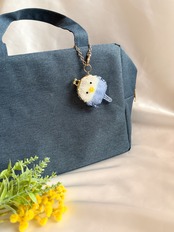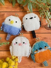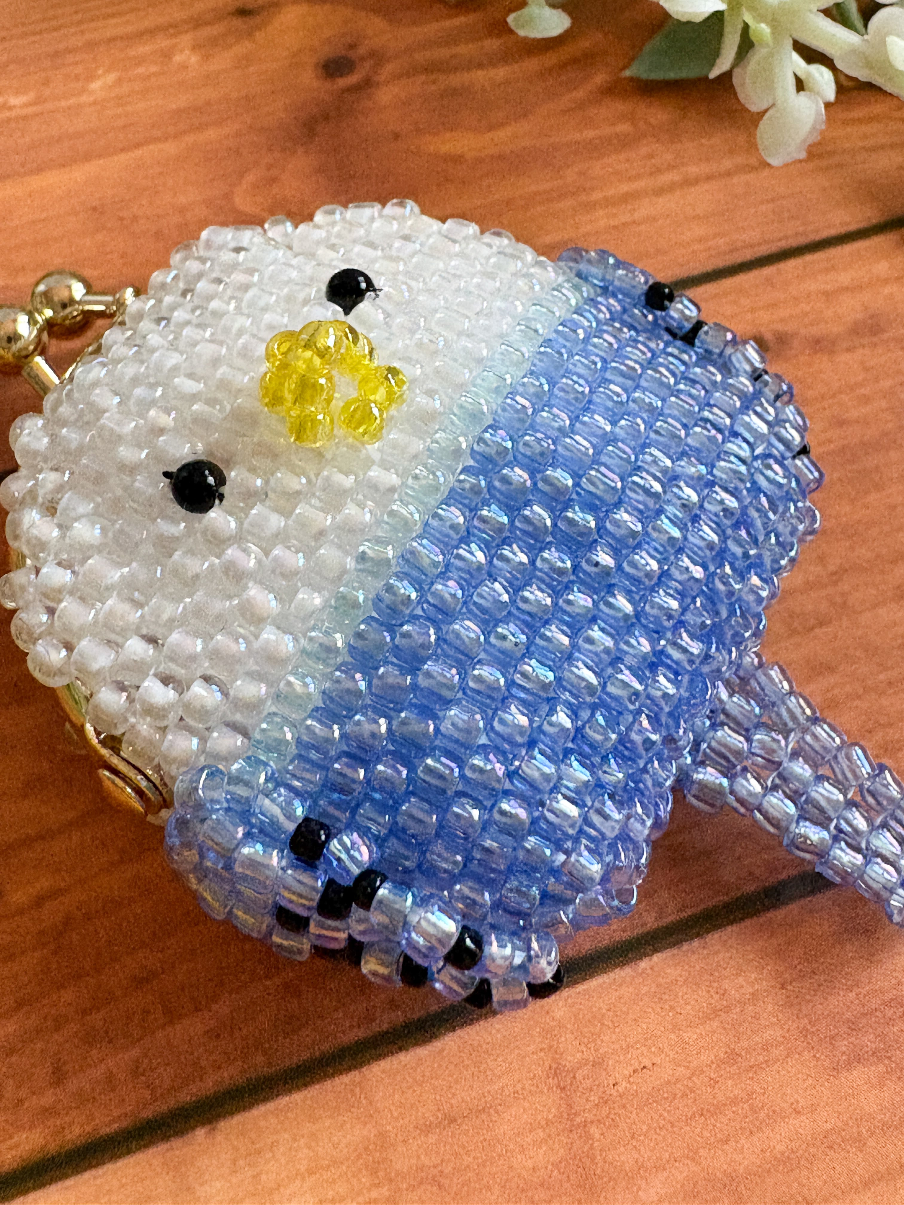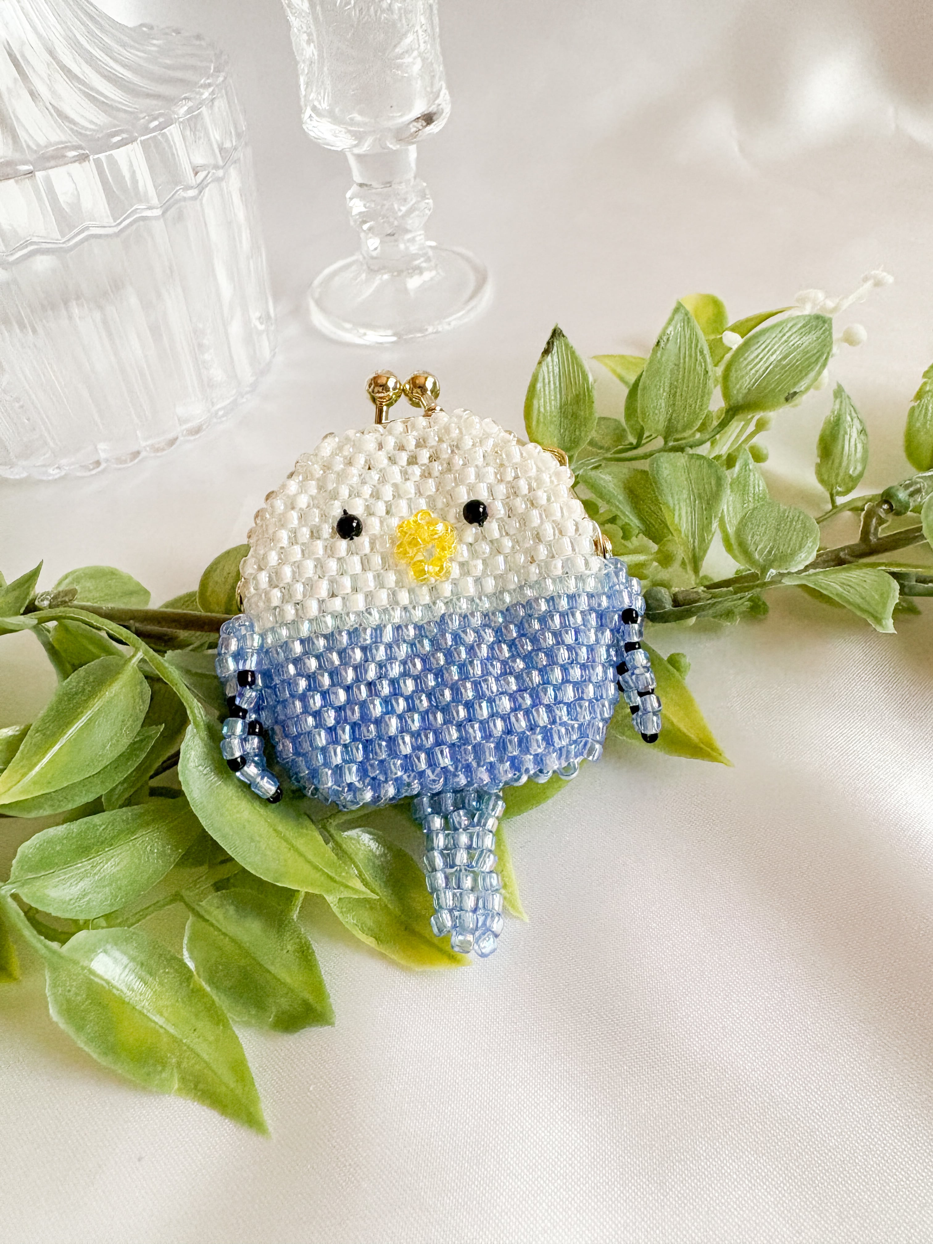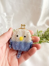 このポーチは、すべてビーズで愛らしく仕上げられており、セキセイインコのほっこりした顔が特徴です。