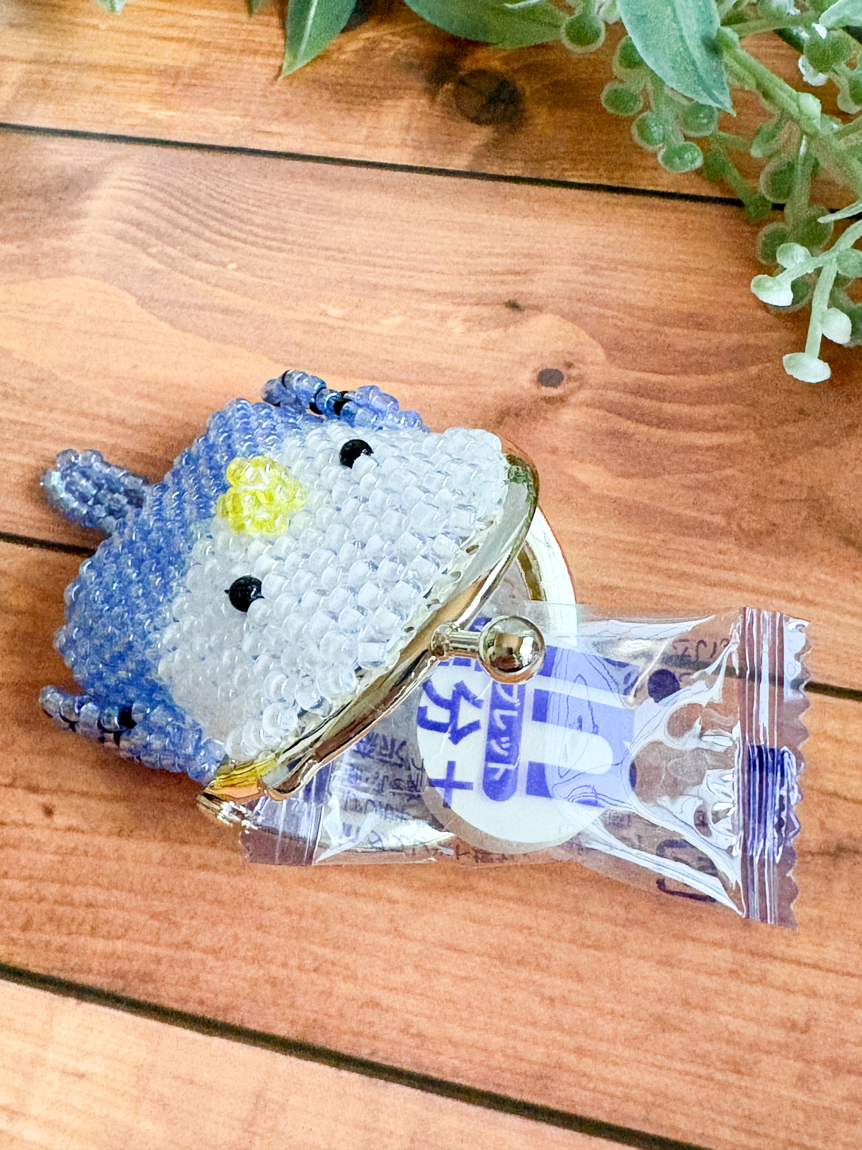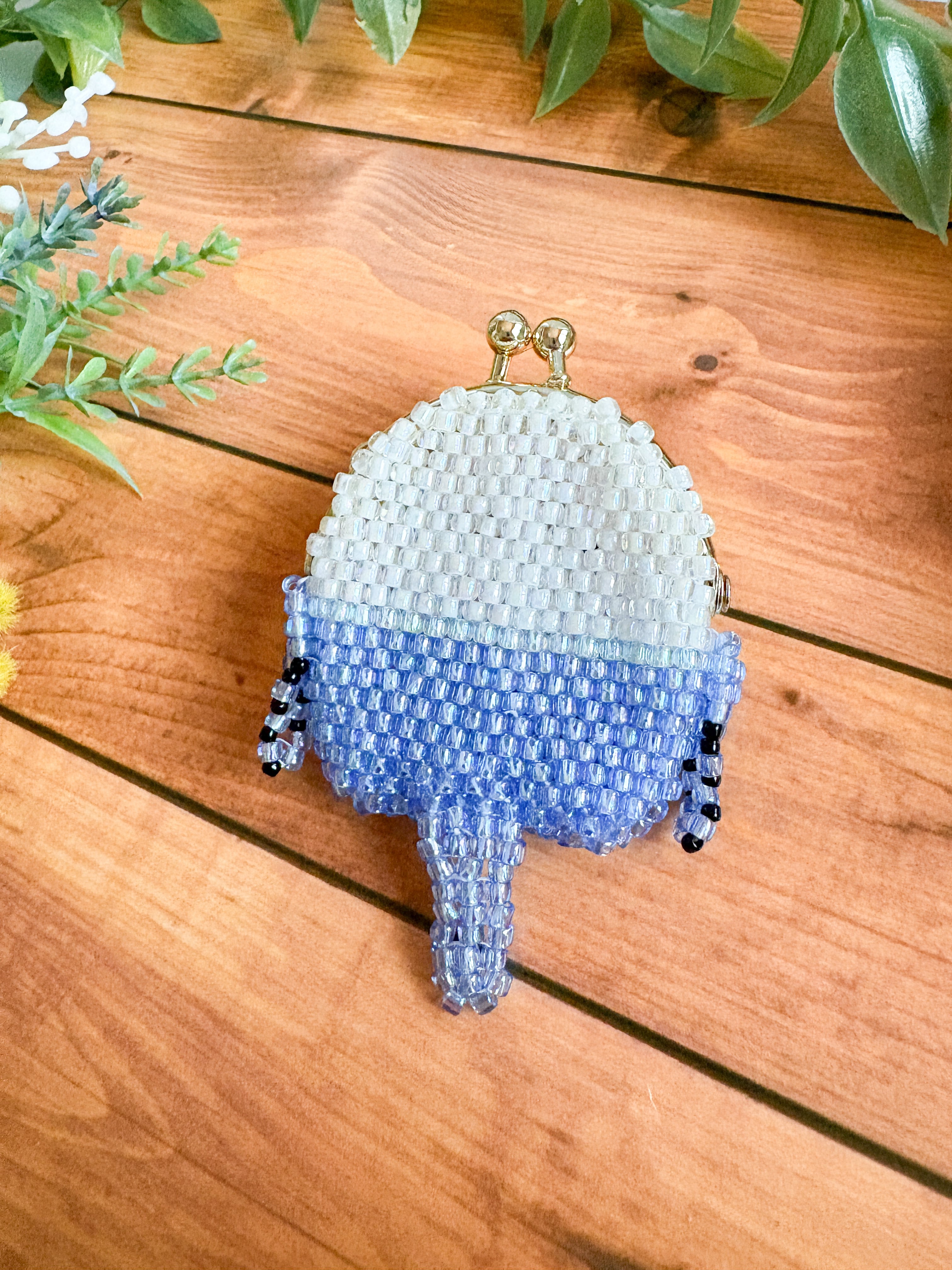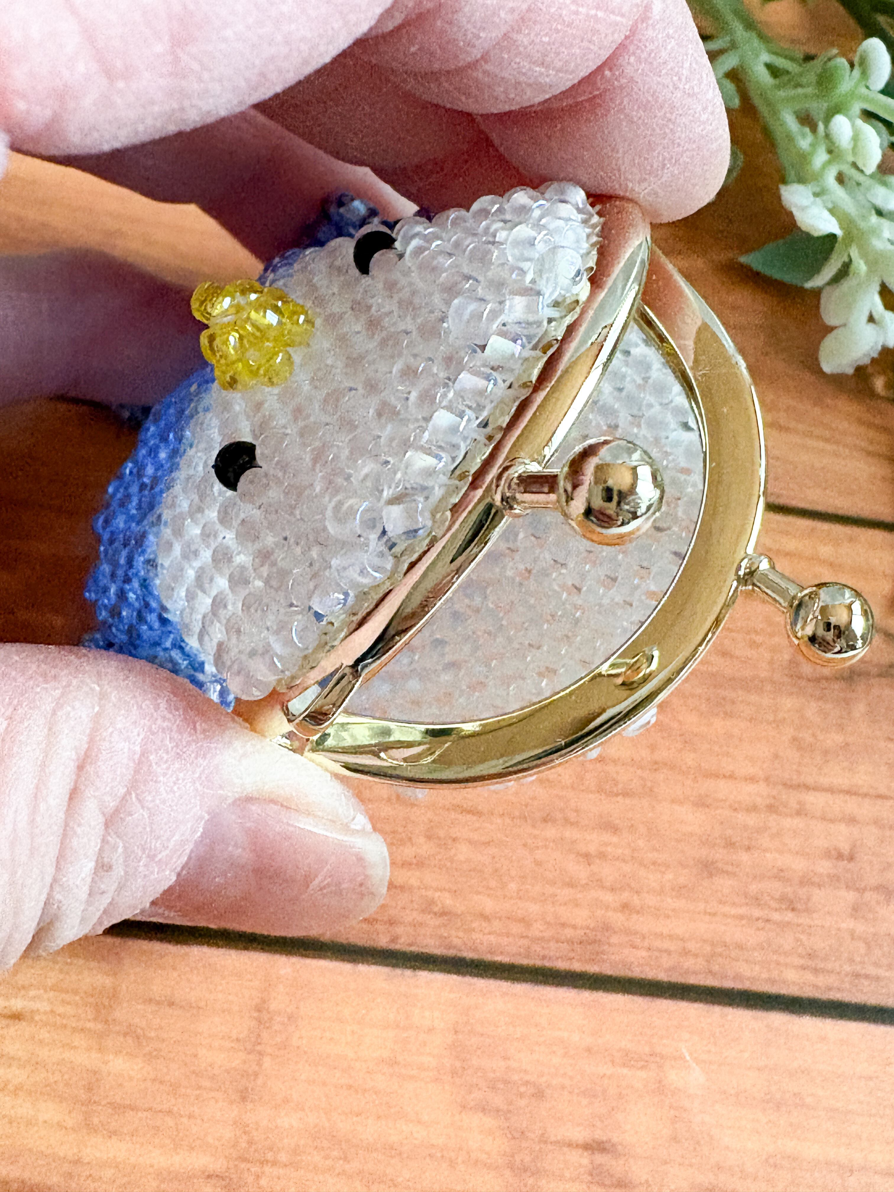 可愛いがま口ポーチは、見る人を癒やすデザインで、ビーズが光を受けてキラキラと輝き、特に明るい空間ではその美しさが一層引き立ちます。
