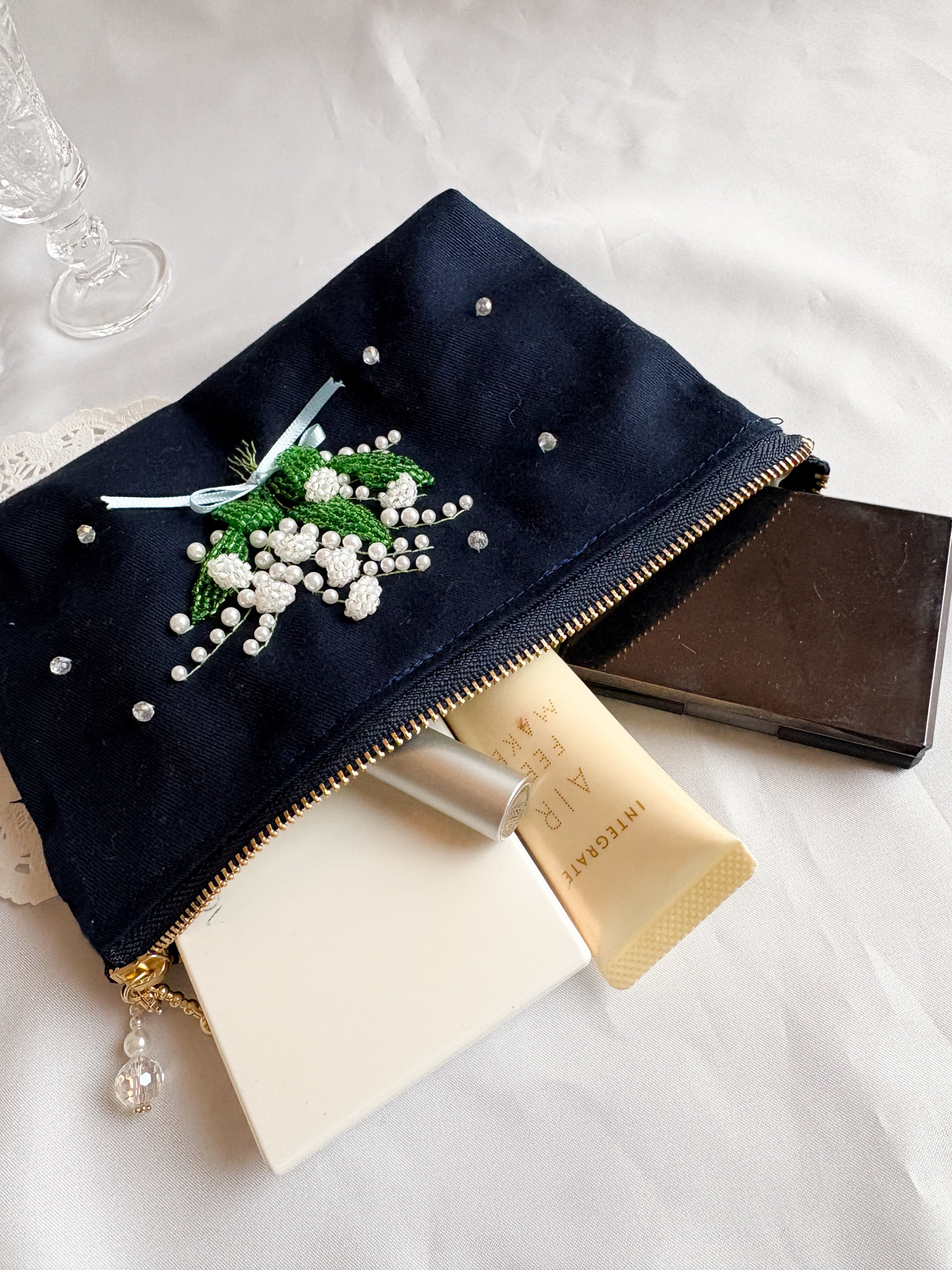 たくさんのすずらんをパールで表現して、華やかなポーチに仕上げました。