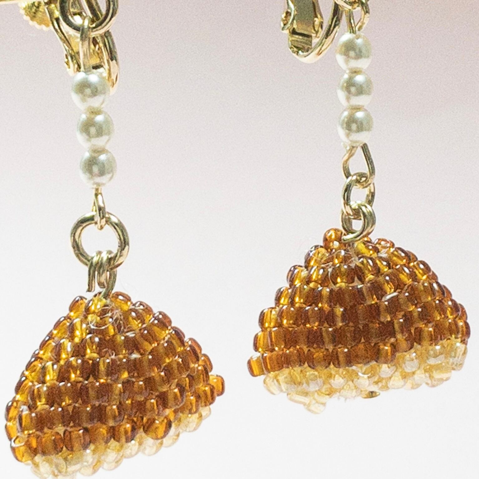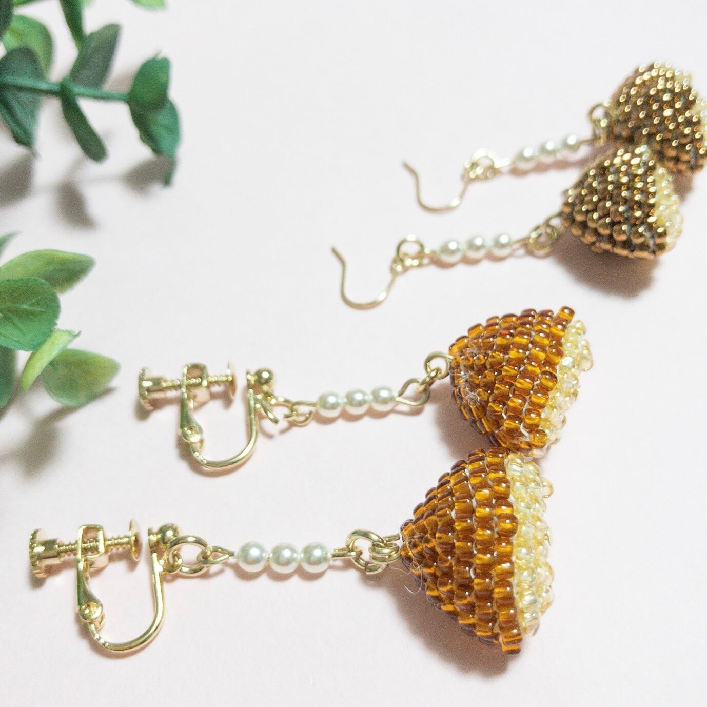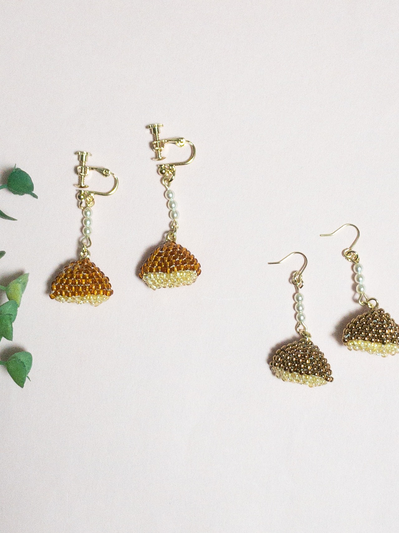 小さなビーズで栗モチーフを作り、イヤリングやピアスにしました。