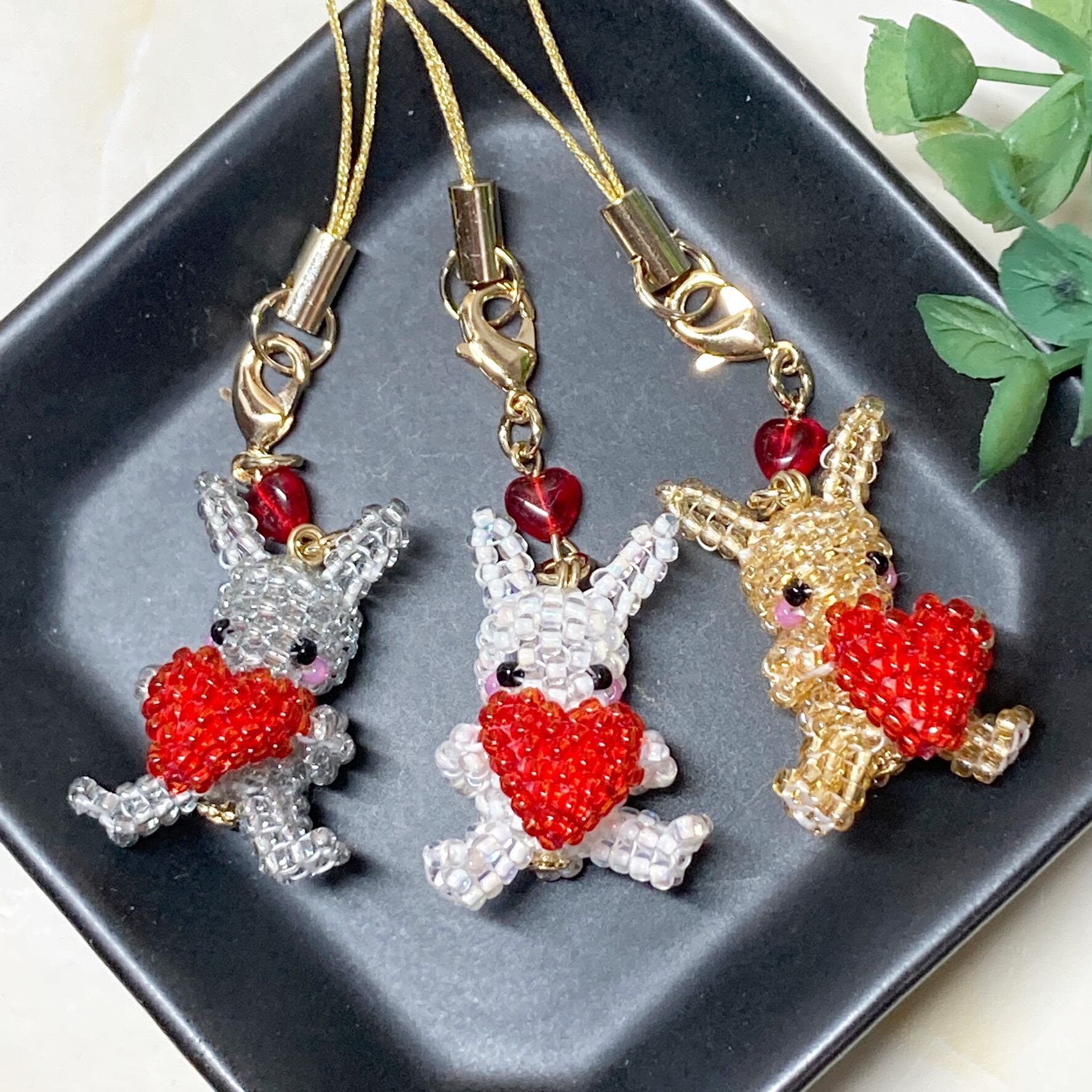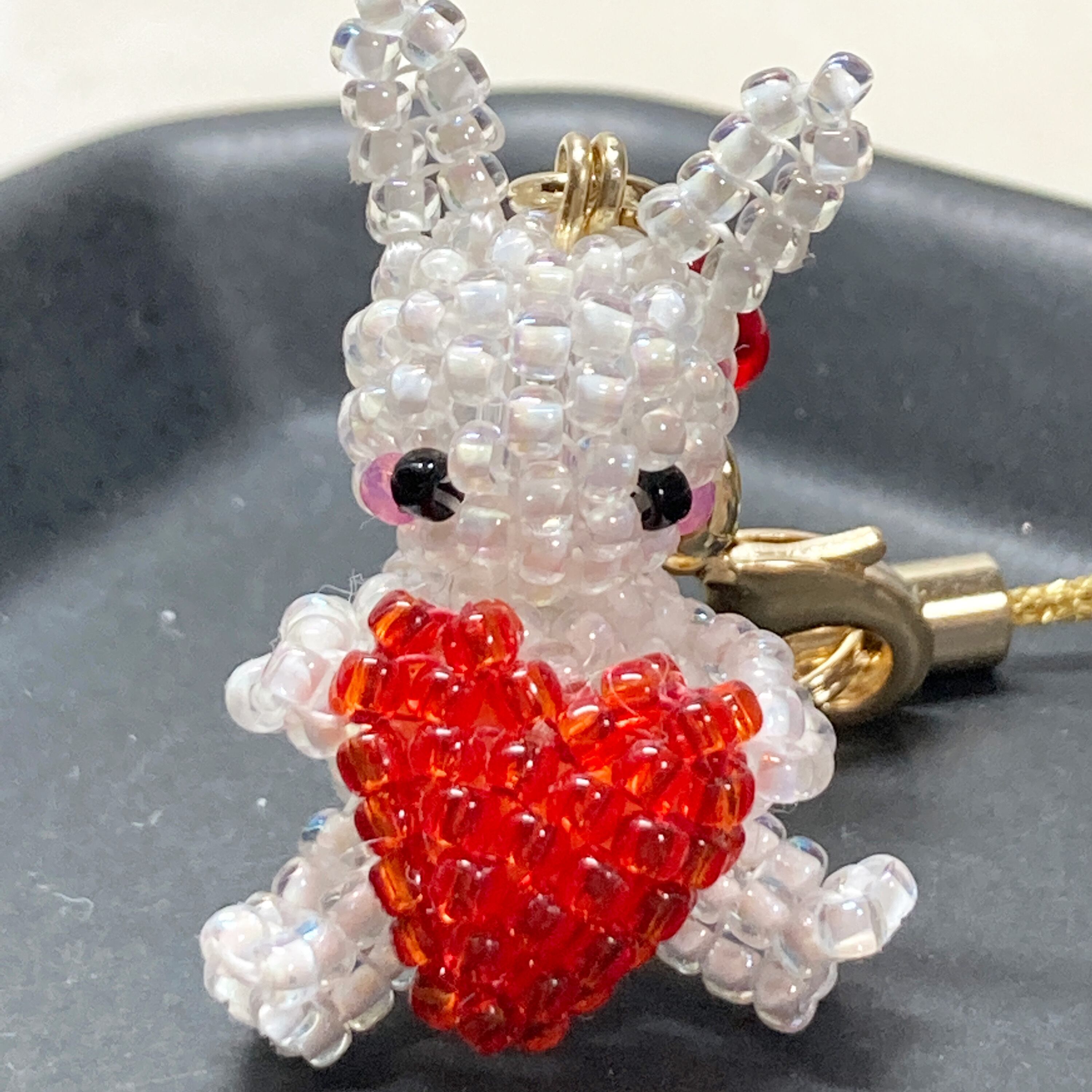 このストラップは、店名が「うさのひみつきち」なので、うさぎのグッズをずっと作りたいと思っていて、バレンタインにむけてハートと一緒のうさちゃんを作ろうと思ってできた作品です。