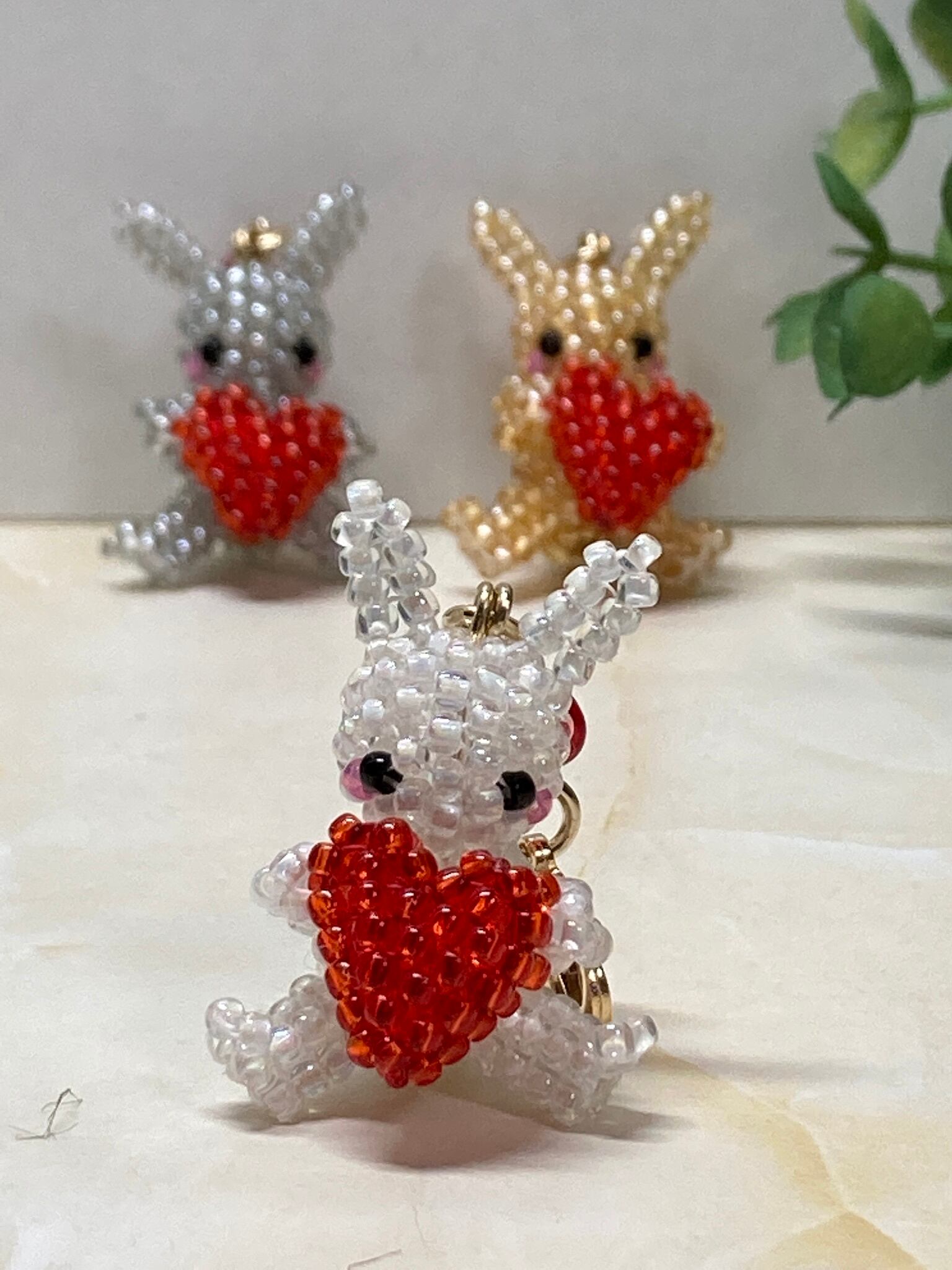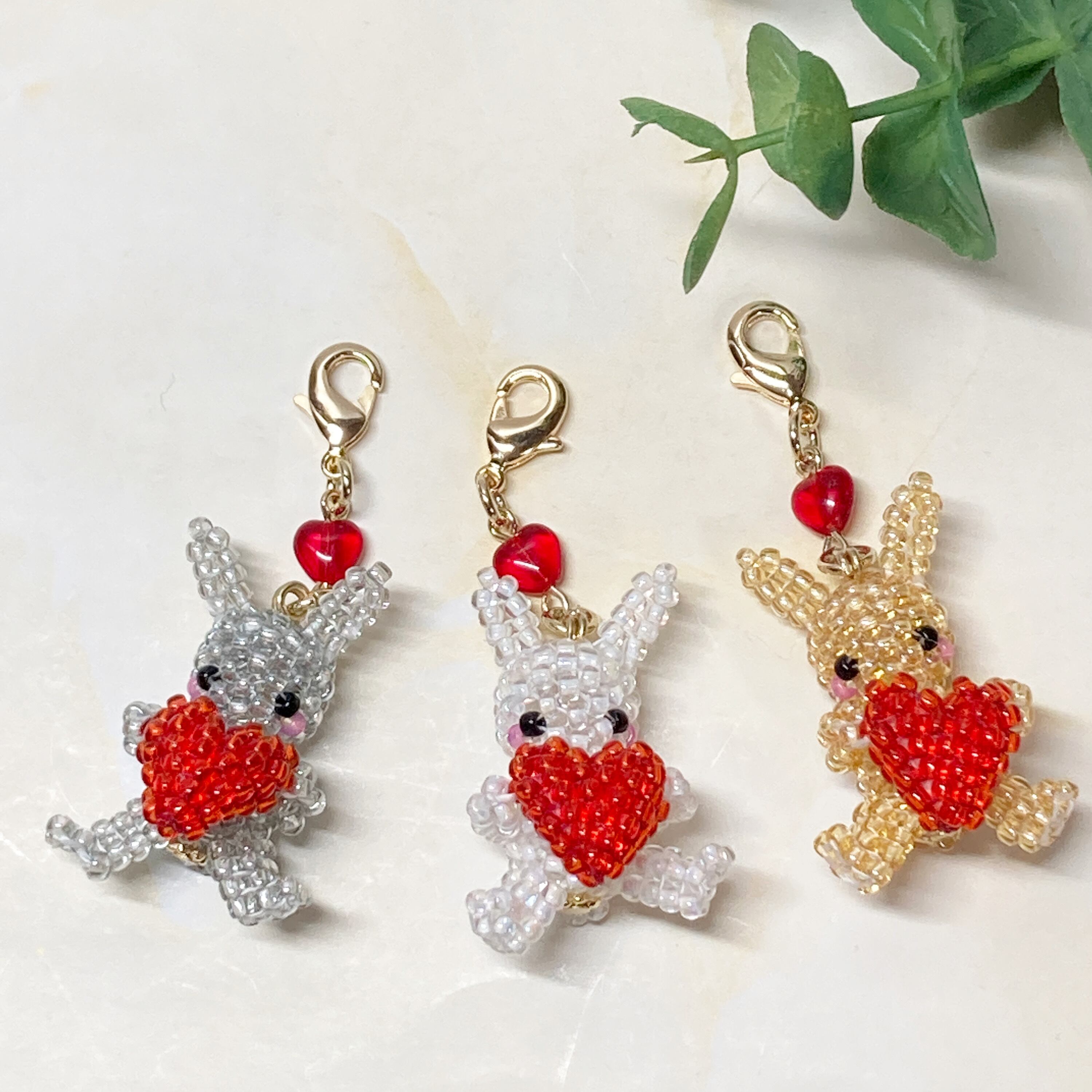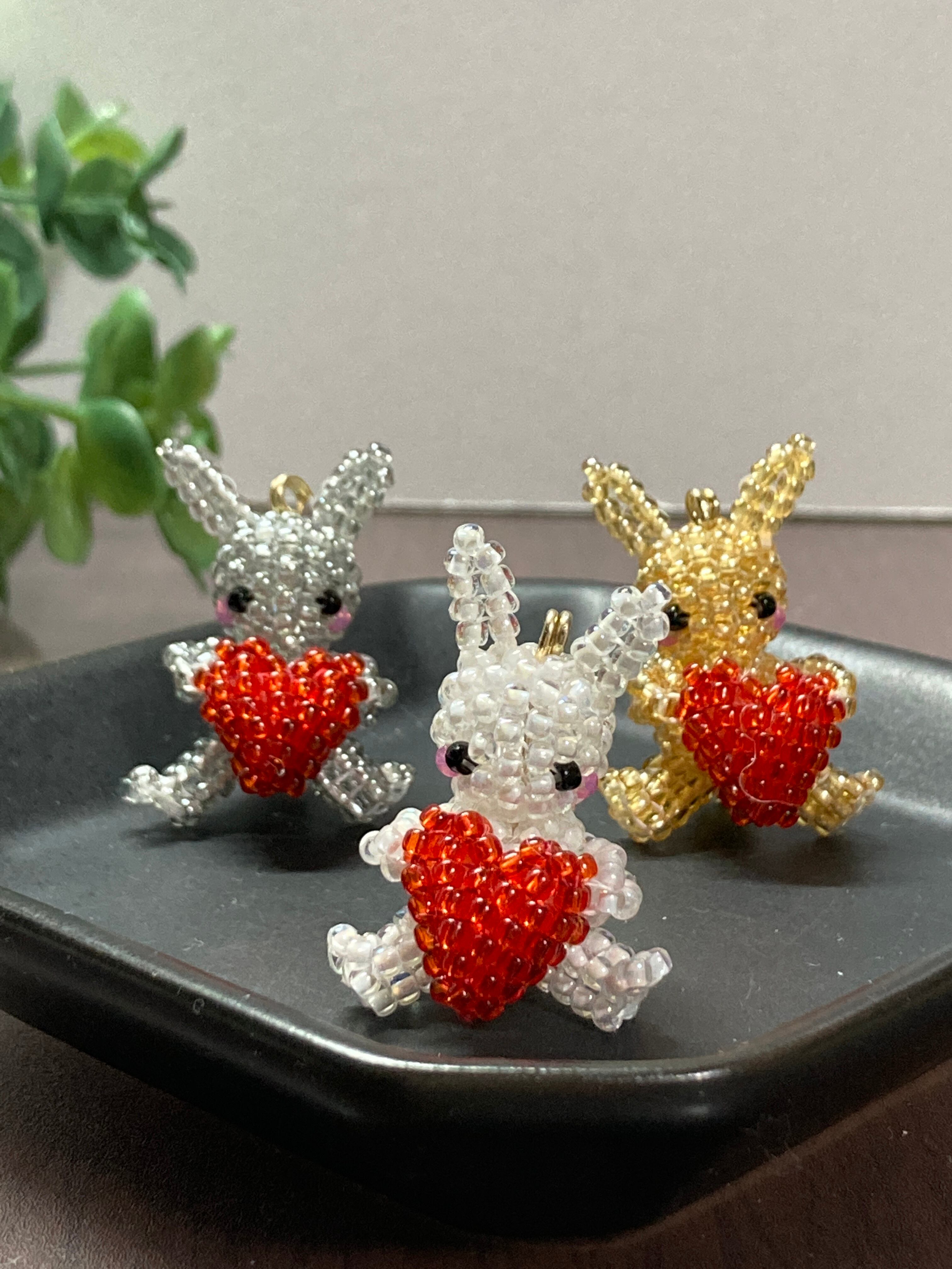 作り方は一緒ですが、使うビーズの大きさなどが微妙に違い、1匹ずつ表情が違っていて、1匹でも3匹でも味があってかわいいです。