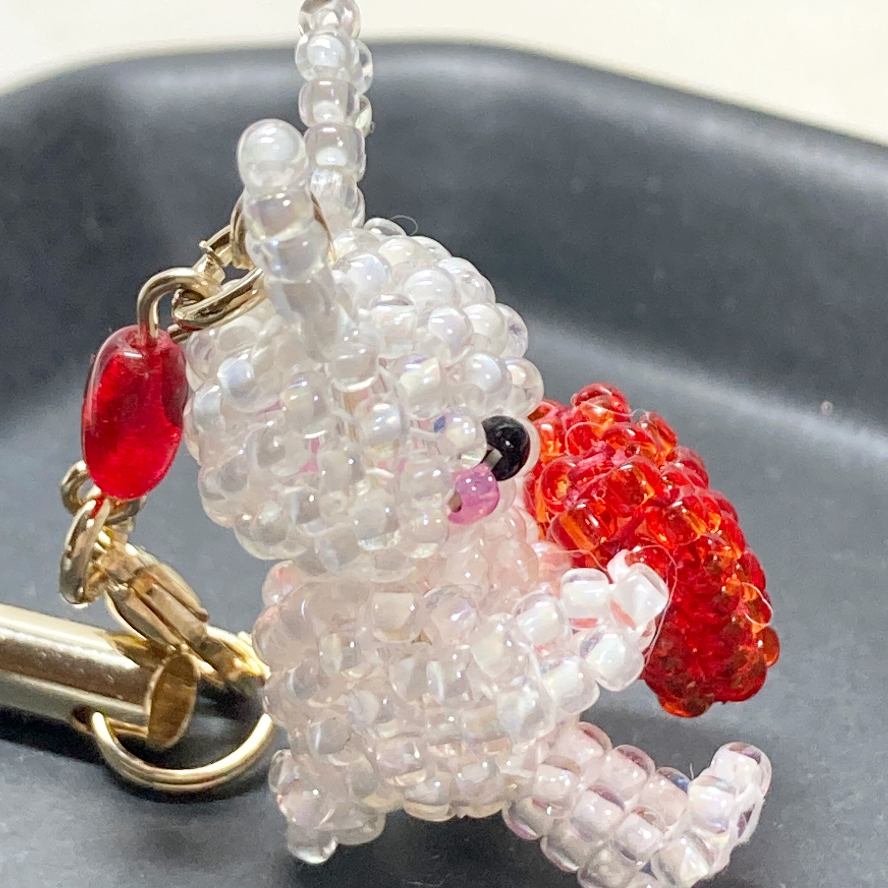 ビーズで動物を作る時はテグスを使って編んでいく方法が多いのですが、他の方の作品とは違いを出したくて、ビーズステッチという技法で作っています。