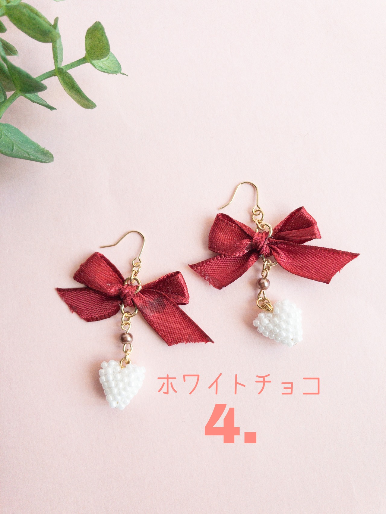 甘いハート形のチョコを可愛くラッピングする、そんなイメージのピアスです。