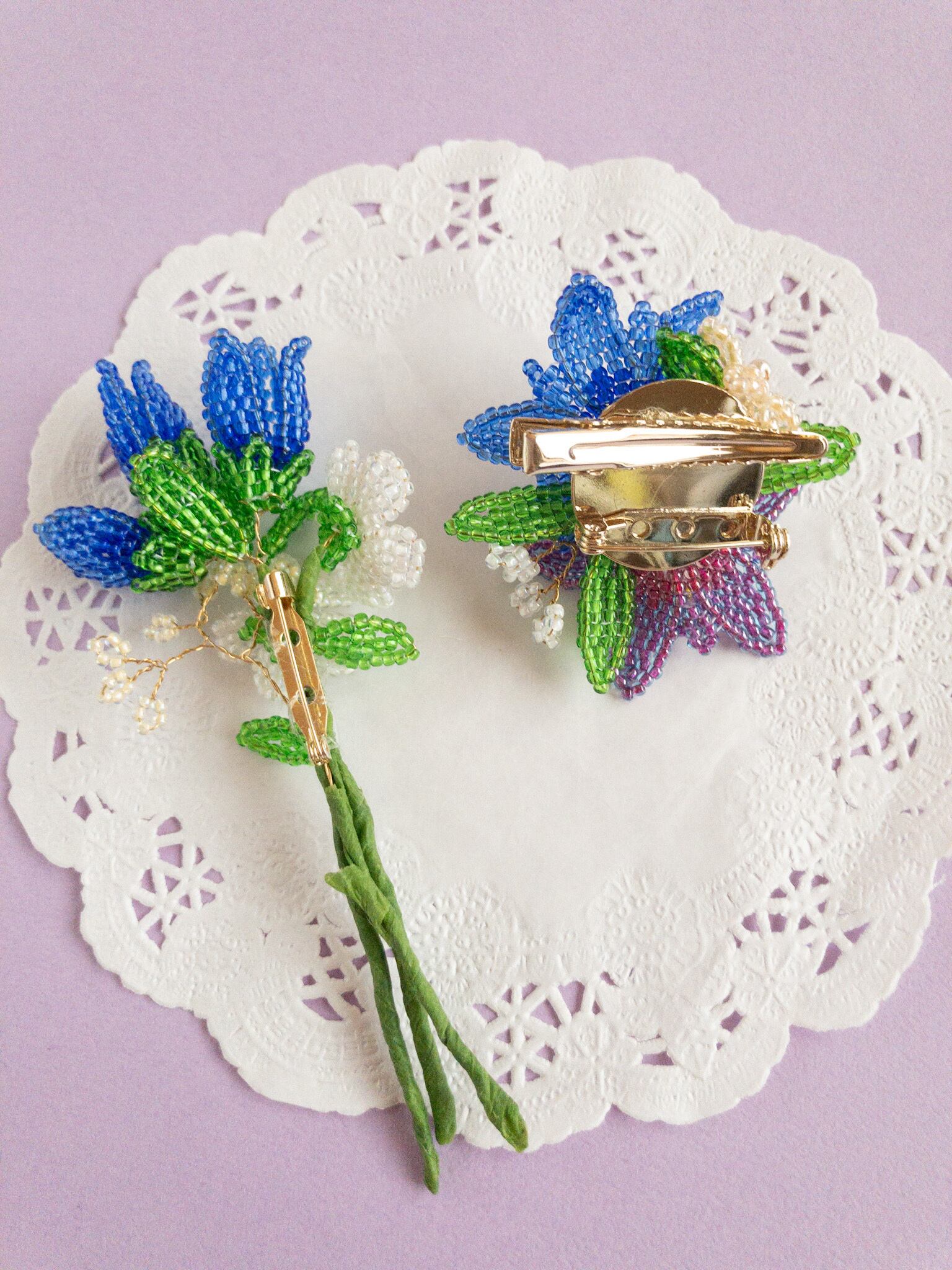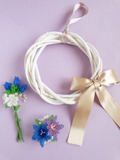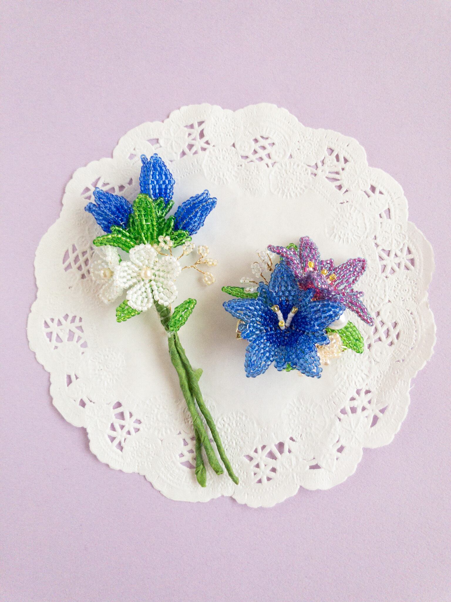 ビーズの花も、青と紫、白と薄い黄色で色を合わせてあります。