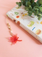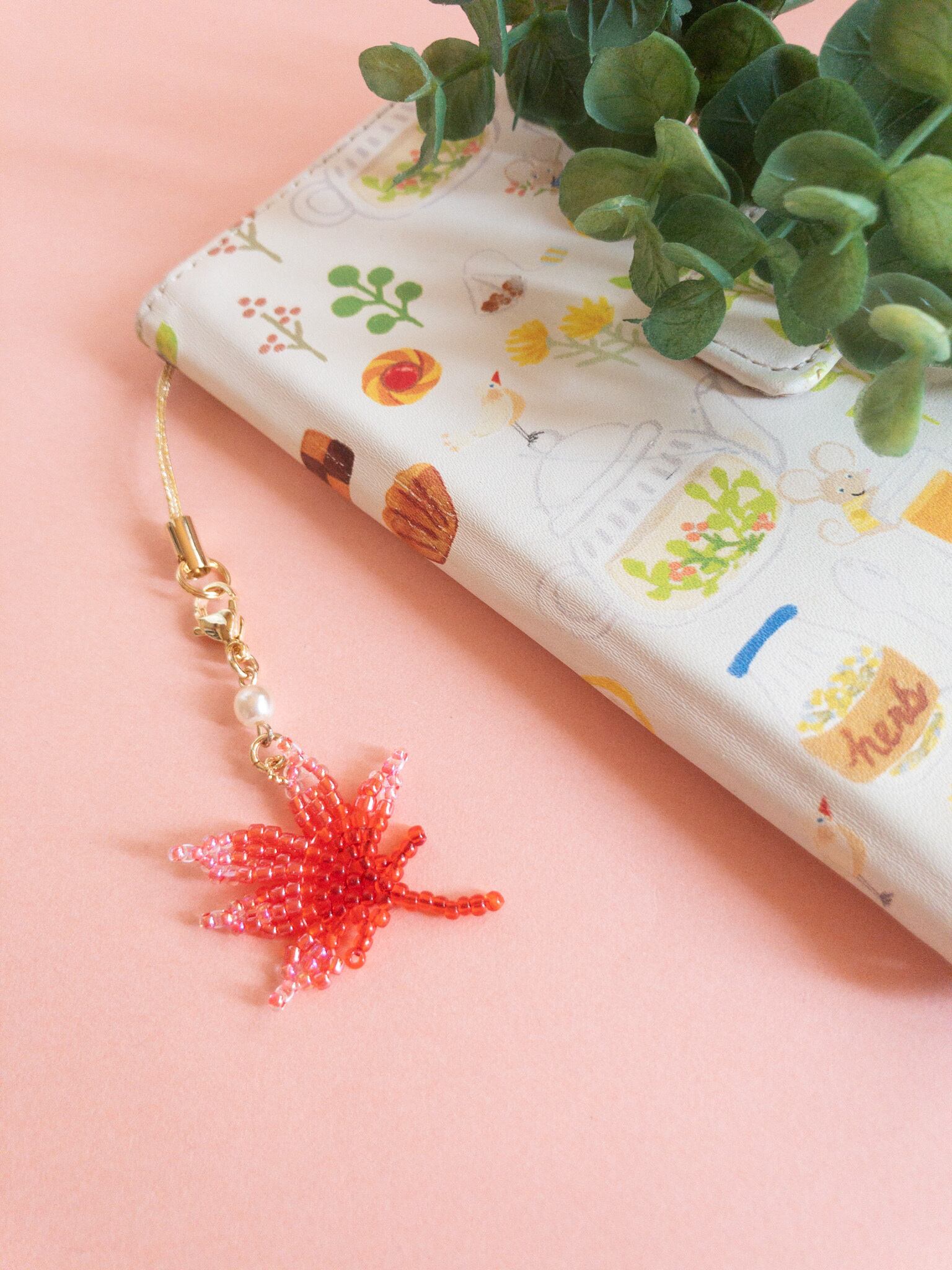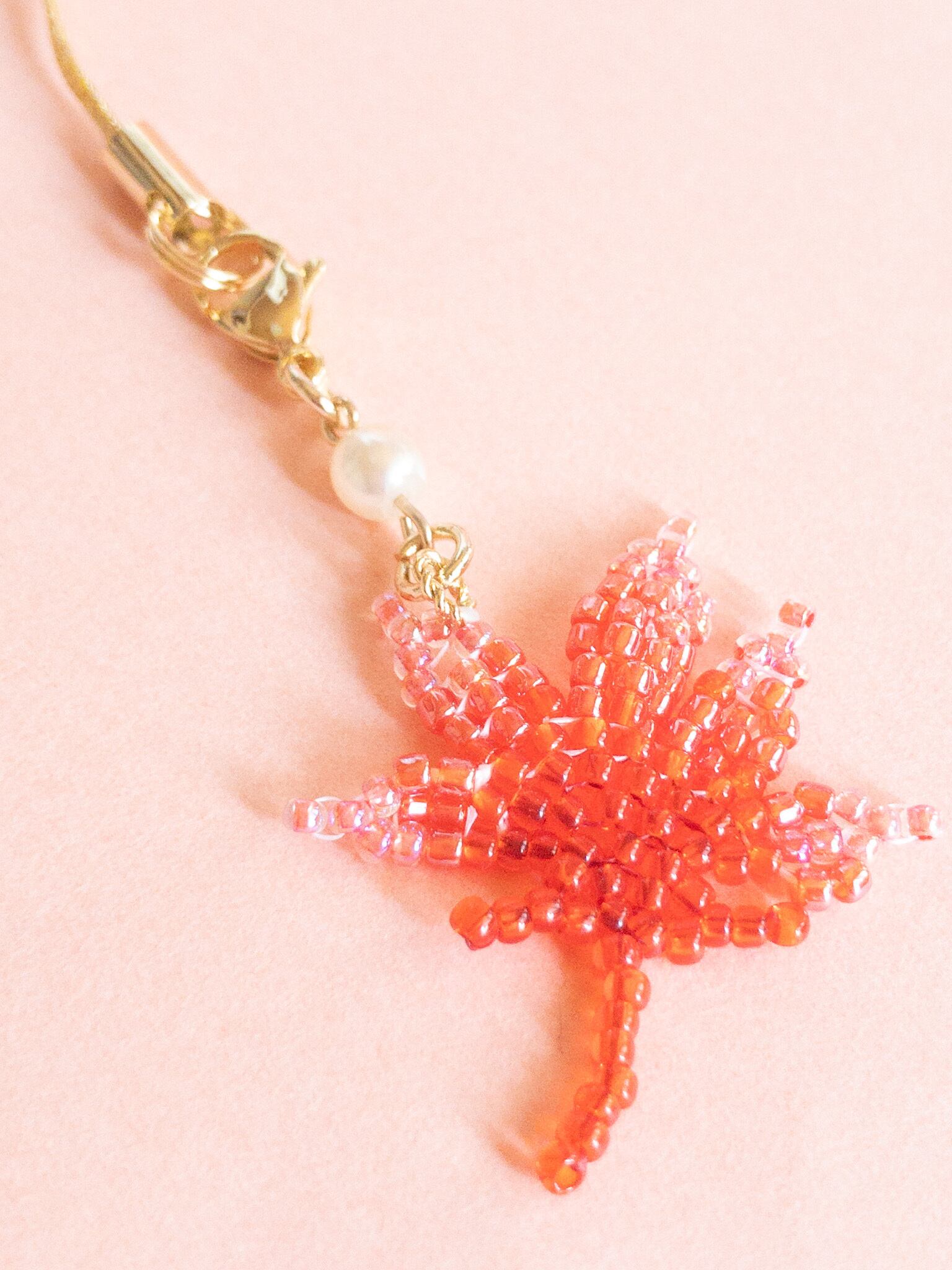 グラデーションのある綺麗な紅葉している葉をビーズで表現できないかと思い、よくある葉をモチーフにストラップを作りました。