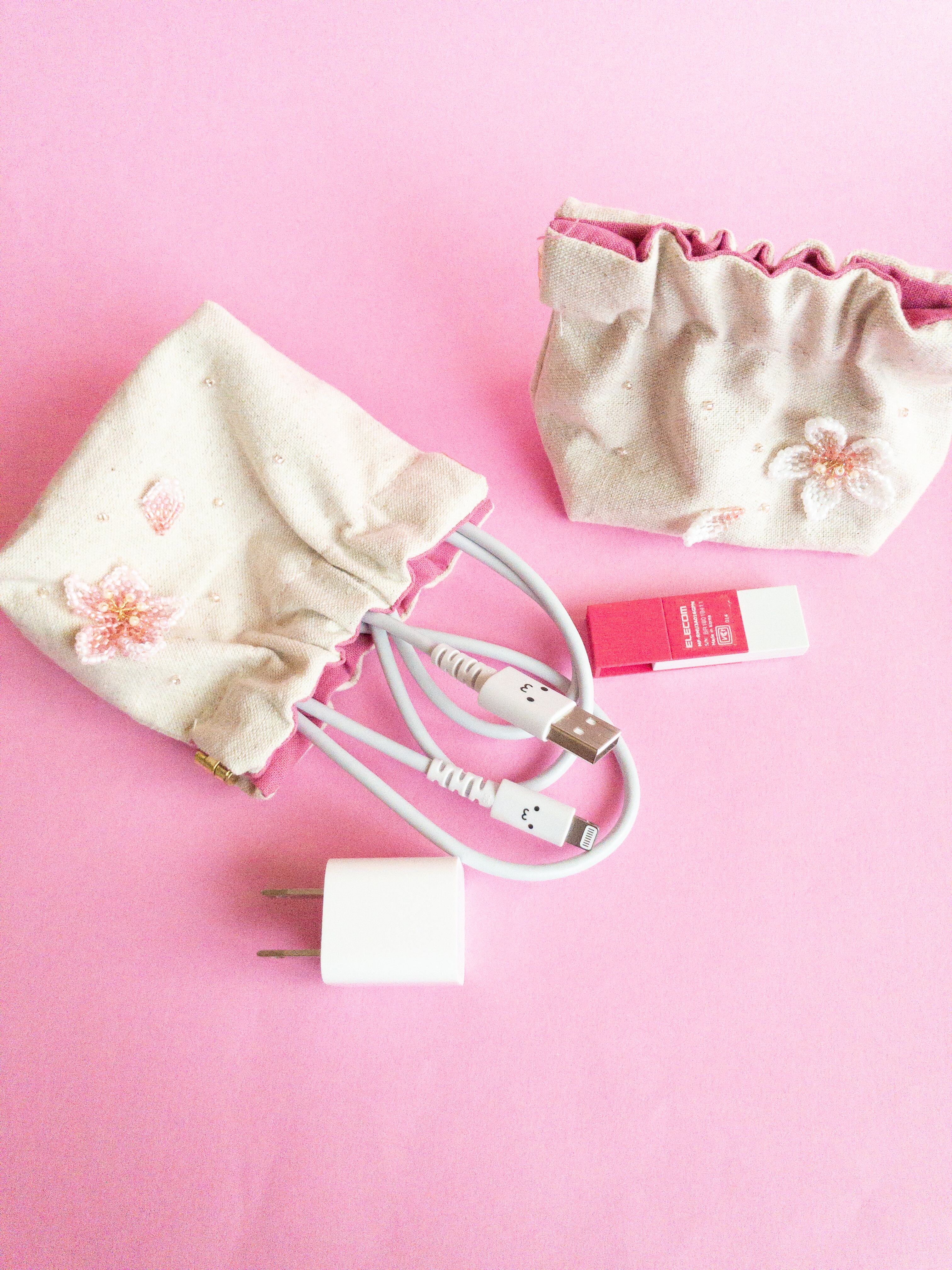 ビーズで作った桜を刺繍して、ころんと小さなポーチにしました。
